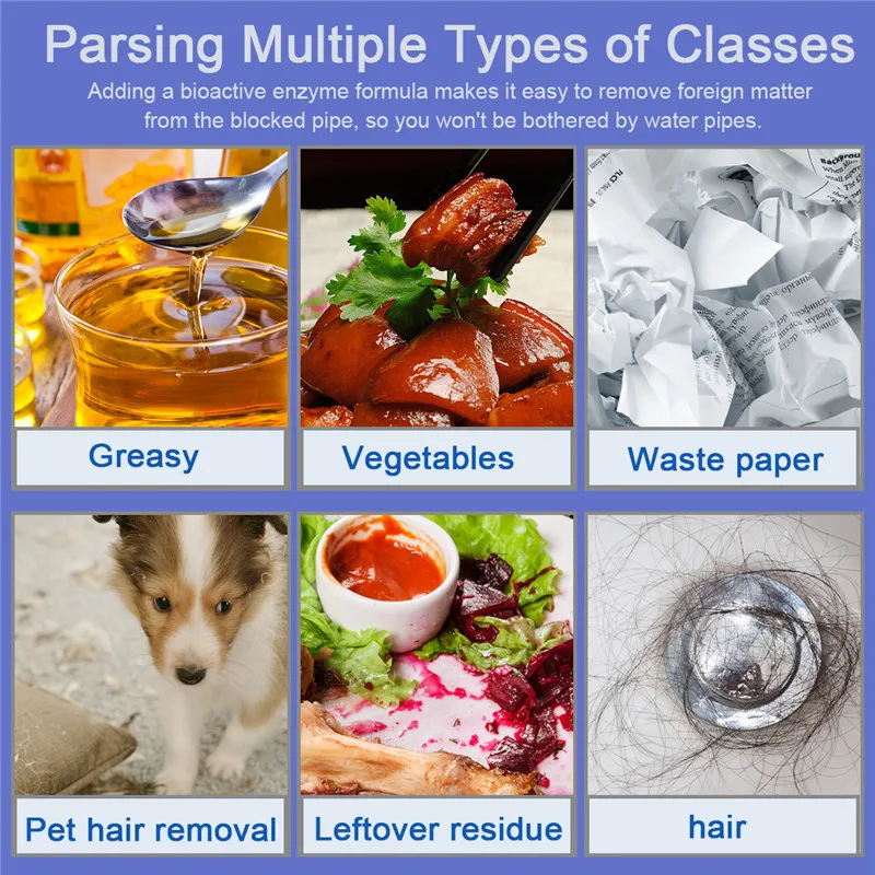 Основное применение: подходит для кухни, балкона, ванной комнаты, туалета и т. Д. Может быстро распадаться и блокировать жир стены, волос, овощей, чая, шерсти домашних животных, фекалий, туалетной бумаги, Кухонных Отходов, таких как блокировка. Держите подальше от слива.