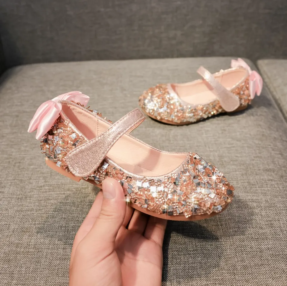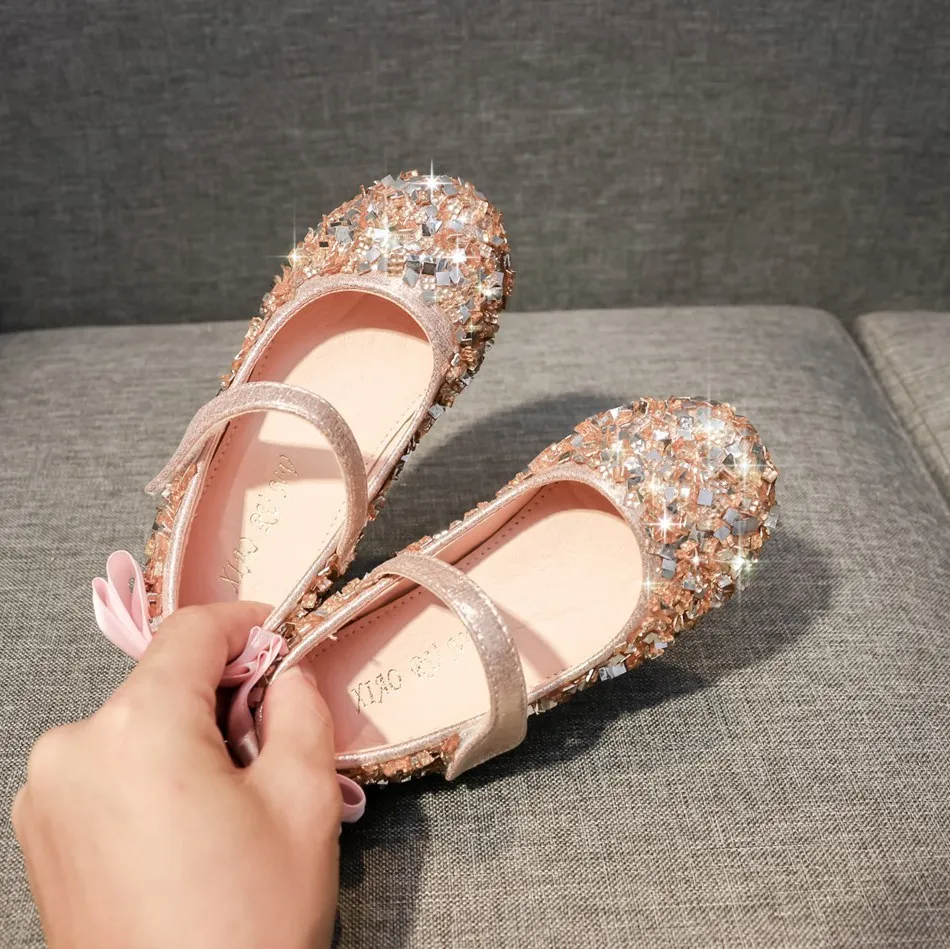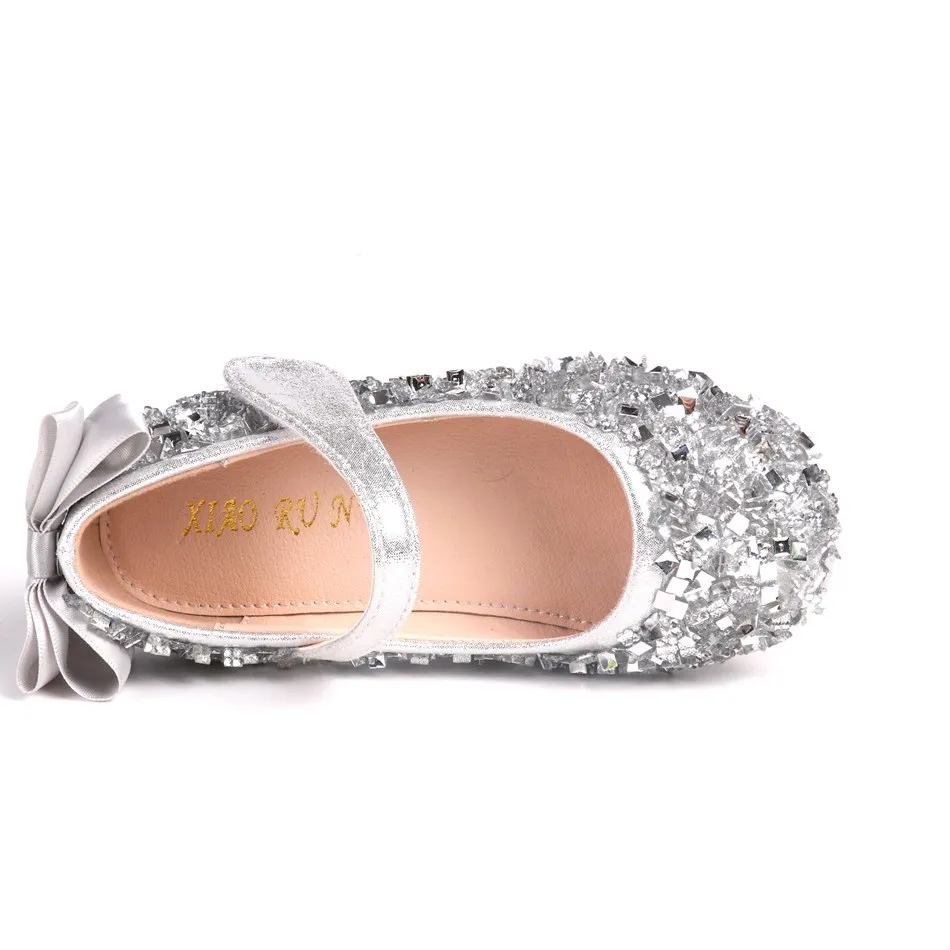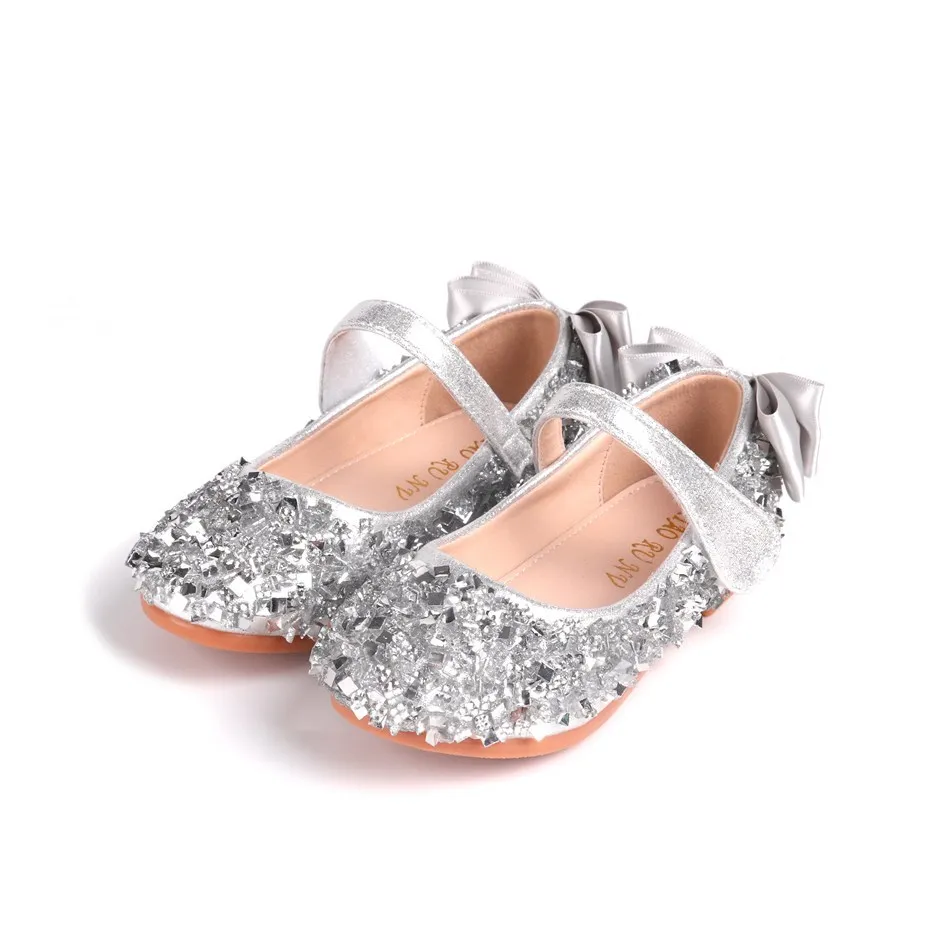 Название платья: Стразы для девочек; Обувь принцессы без застежки; Детские балетки на плоской подошве с бантом сзади; Блестящие свадебные туфли Mary Jane
