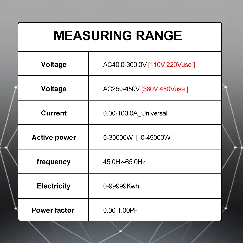 Электрическая мощность: 0-450000 Вт, разрешение электрической мощности составляет 0,1 Вт при измерении электрической мощности в диапазоне 0-9999,9 Вт, в противном случае разрешение электрической мощности составляет 1 Вт.