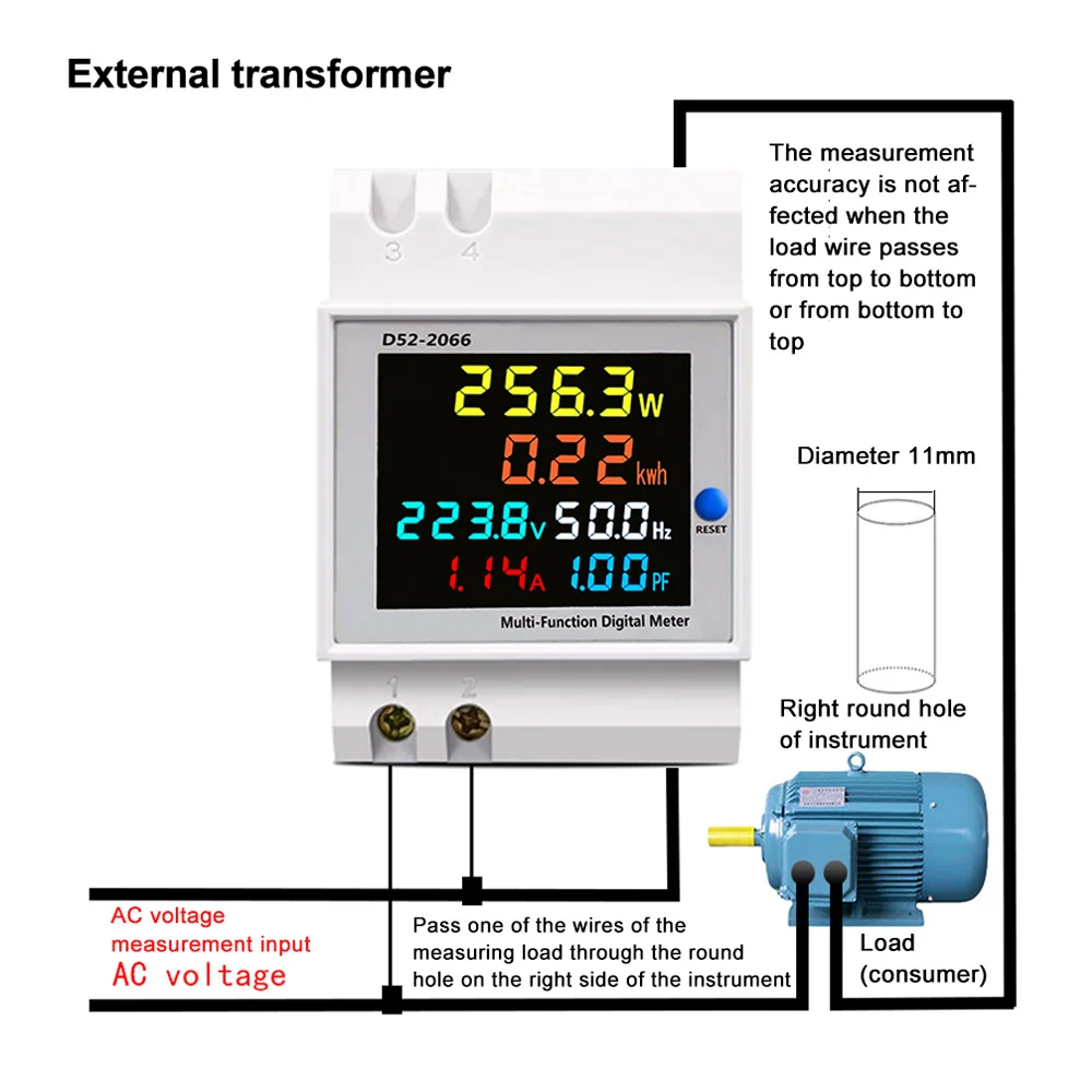 3. Соединение измерителя с внешним трансформатором тока как на графике 2. Проденьте провод через отверстие в счетчике и Подключите два провода вторичного трансформатора к клемме 3 и 4.