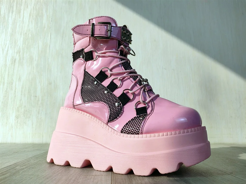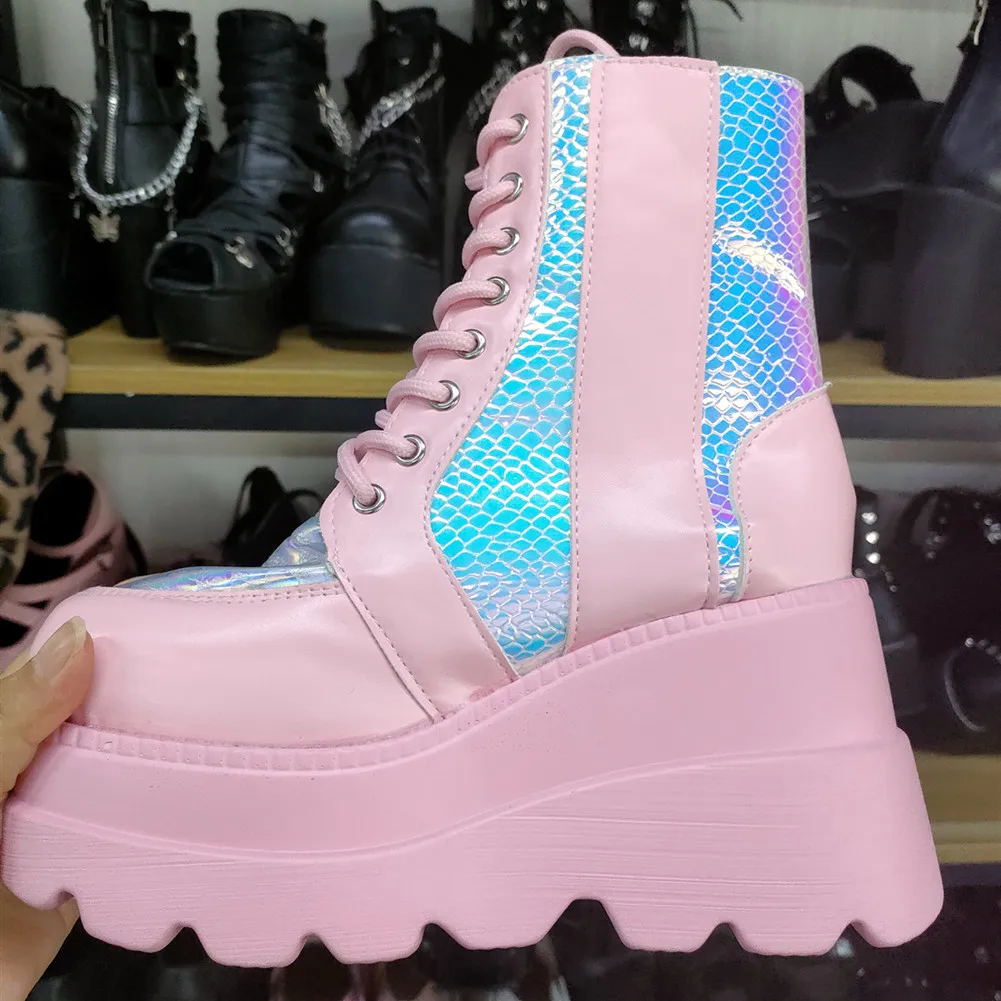 Лидер продаж; Модные женские короткие ботильоны; Розовые ботинки; Милые ботинки на танкетке; Ботинки на молнии; Обувь на шнуровке; Женская брендовая Новая повседневная обувь