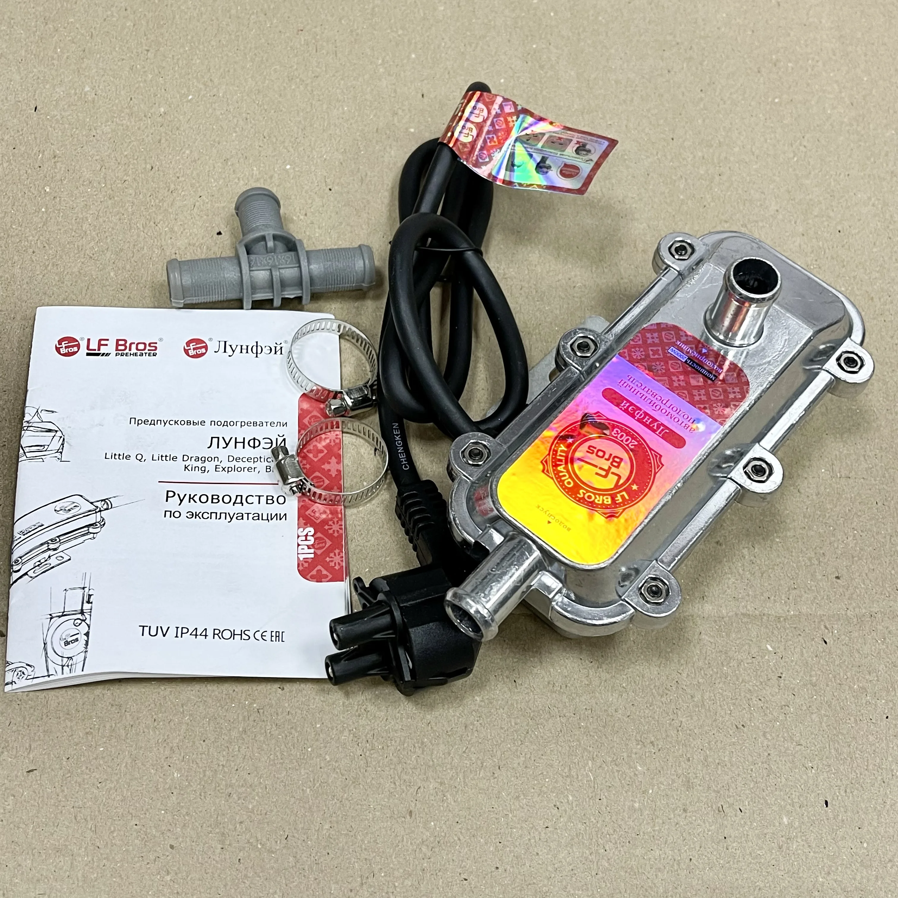 В комплект подогревателя входит подробная инструкция на русском языке со схемами монтажа и правилами эксплуатации, и монтажный комплект - два хомута и тройник. Установить подогреватель Лунфей возможно как в автосервисе так и самому.