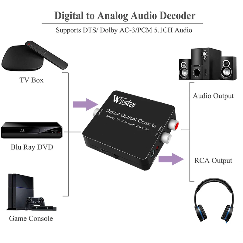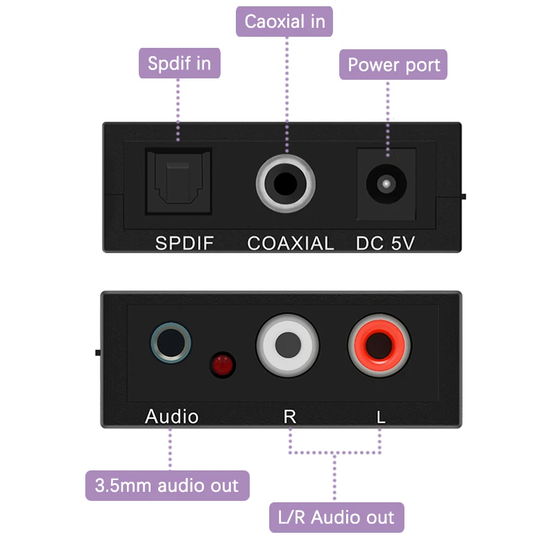 Преобразует SPDIF оптический или коаксиальный цифровой PCM аудио вход в аналоговый стерео L/R RCA и 3,5 мм выход для наушников одновременно