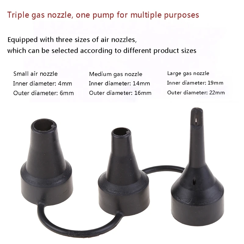 Легко установить, выбрать сопло соответствующего размера и установить его на воздушный насос, а затем надуть предмет, маленький размер один подходит для маленьких игрушек, средний и большой подходит для бассейна, лодки, надувной кровати.
