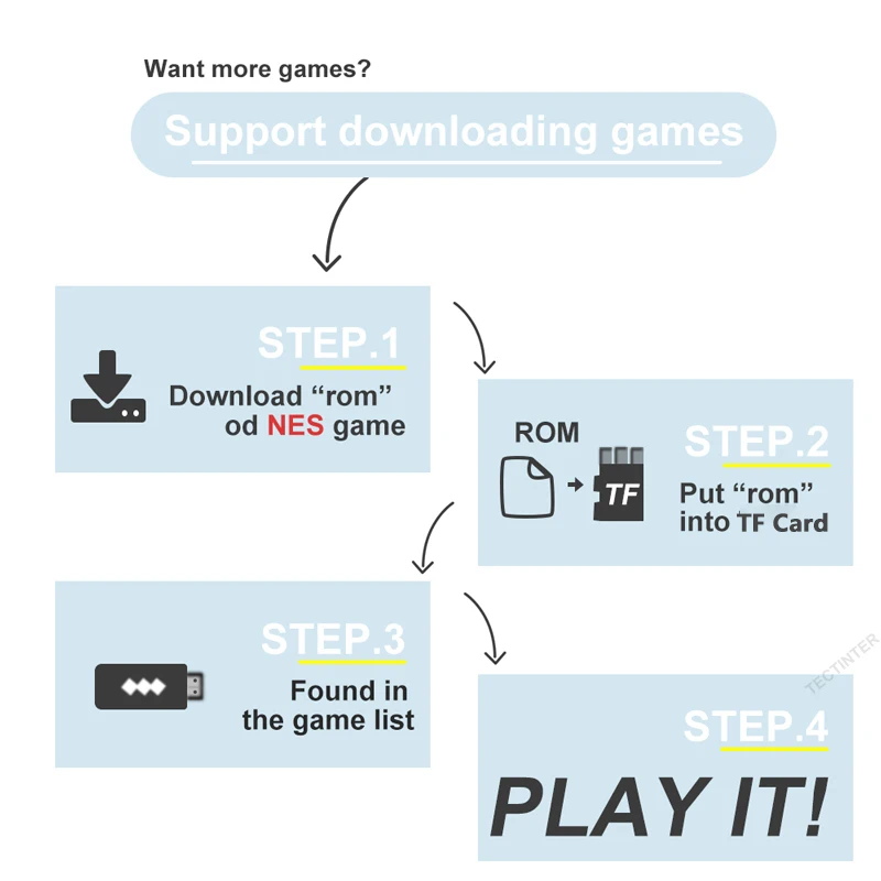 Вы также можете скачать любимые игры, просто скачайте игру на tf-карту, но поддерживает только игры в формате NES.
