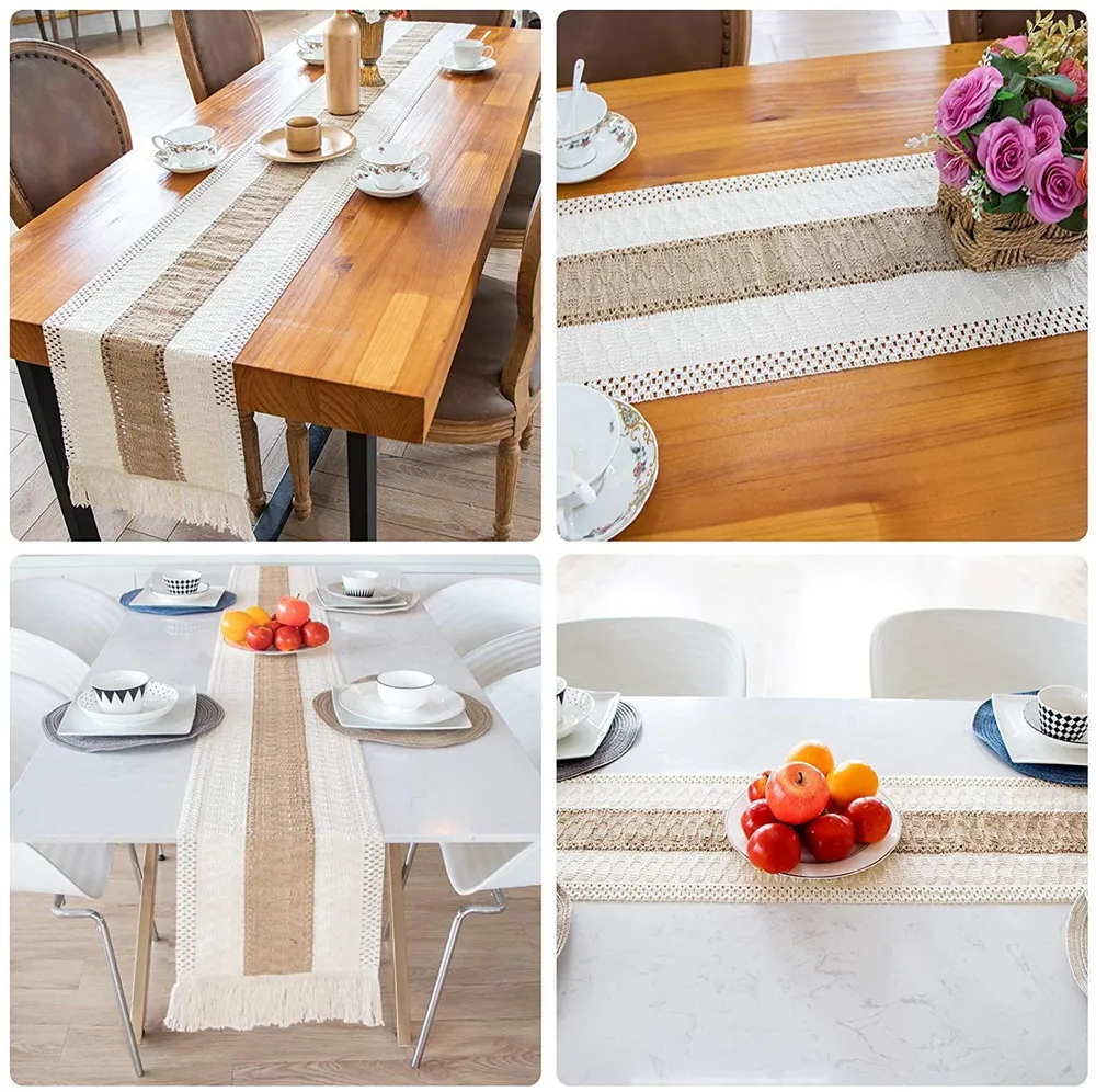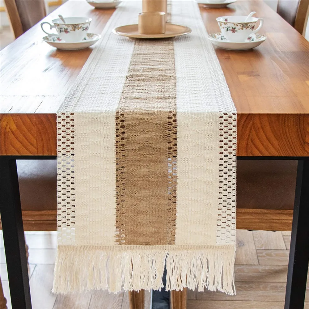 Cilected New Cotton And Linen Splicing Tassel Table Runner For Wedding Banquet Farmhouse Table Decoration Beige Long Tablecloth