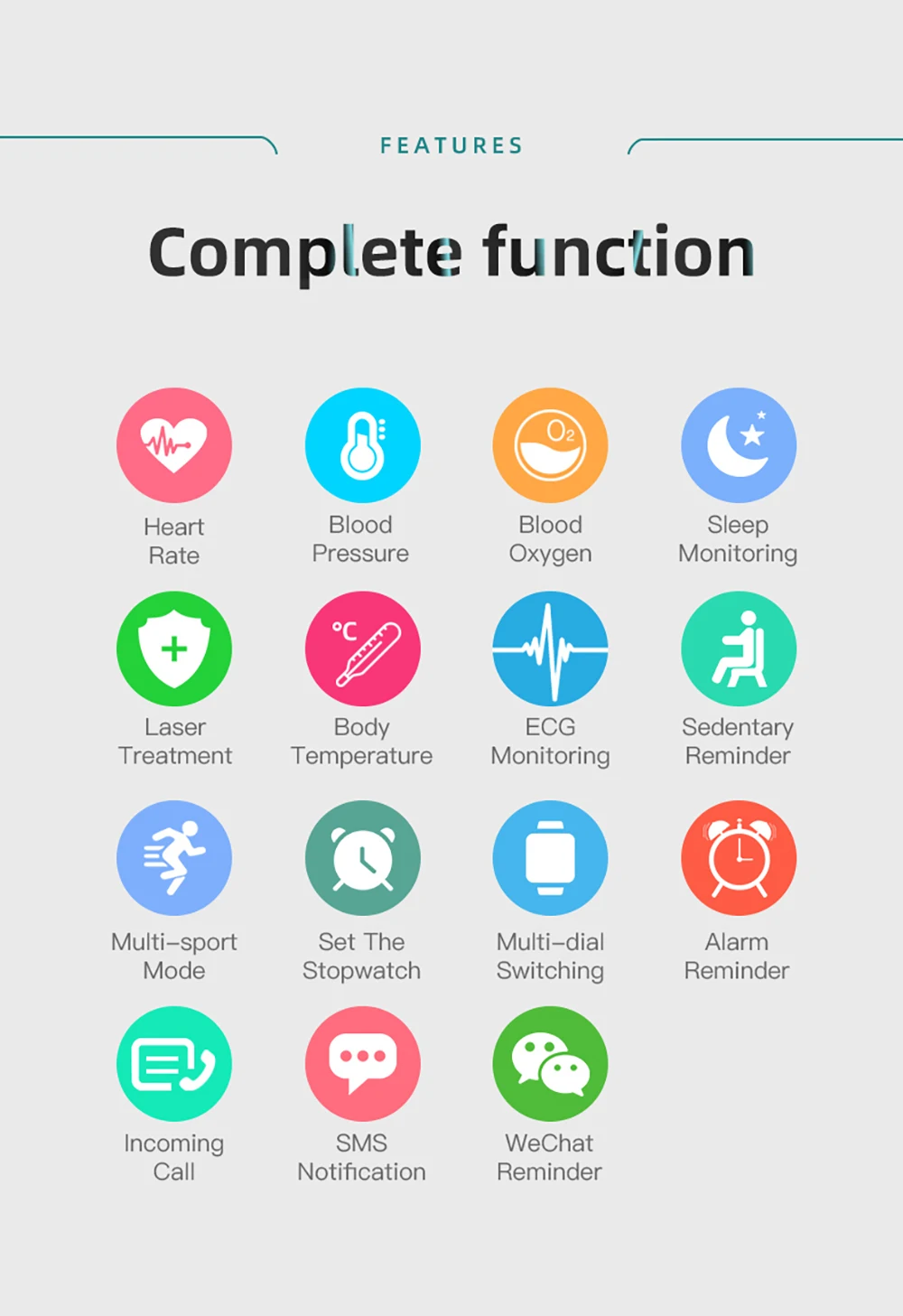 4.others:Time, Steps, Distance, Calories, Sleep Monitoring, Sedentary Seminder, Phone Search,Camera Control,..etc.