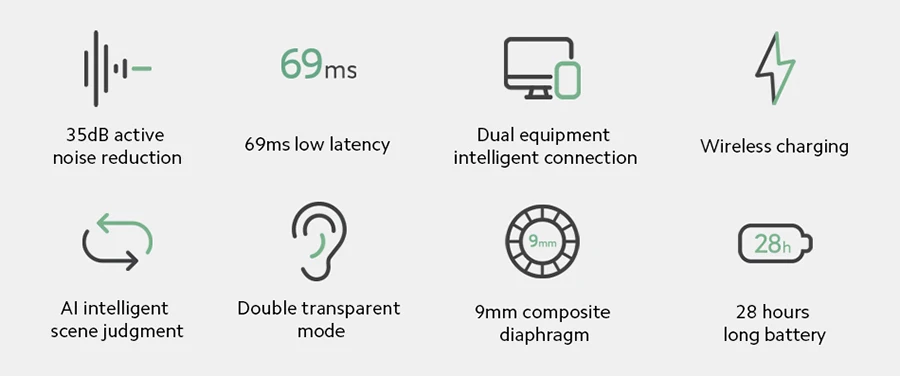 Standby Time: about 28 hours (noise reduction turned off, 50% volume, AAC encoding), Cooperate with the charging box