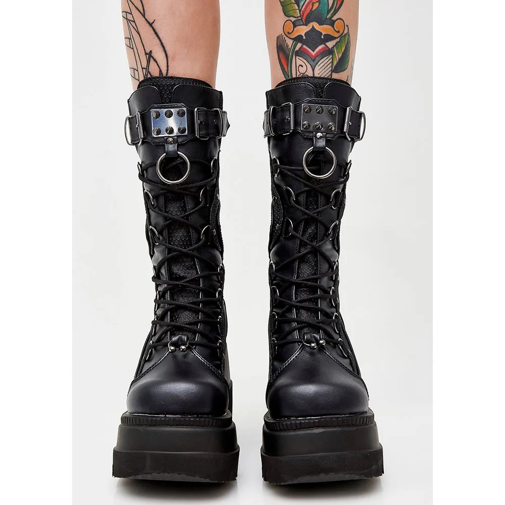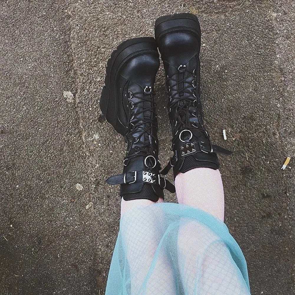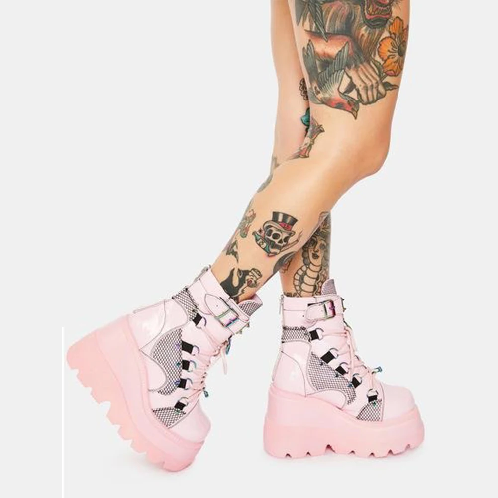 Gilrs Lace Up Buckle Strap Metal Design Platform Wedges Boots Women Sugar Pink Goth Shoes Woman 2021 New Arrivals Sweet Fashion
