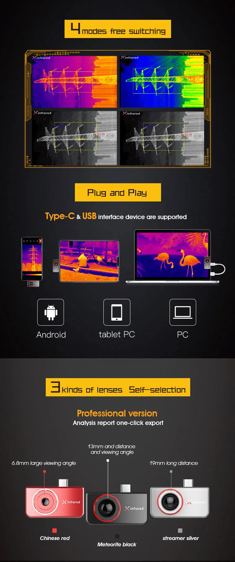 It supports accurate temperature measurement of point, line, and surface and can directly generate professional reports and instant cloud analysis. SDK development kit is also available. The T3Pro helps you find invisible problems faster than ever, whether you're inspecting electrical panels, troubleshooting mechanical systems, looking for HVAC problems, or finding water damage.