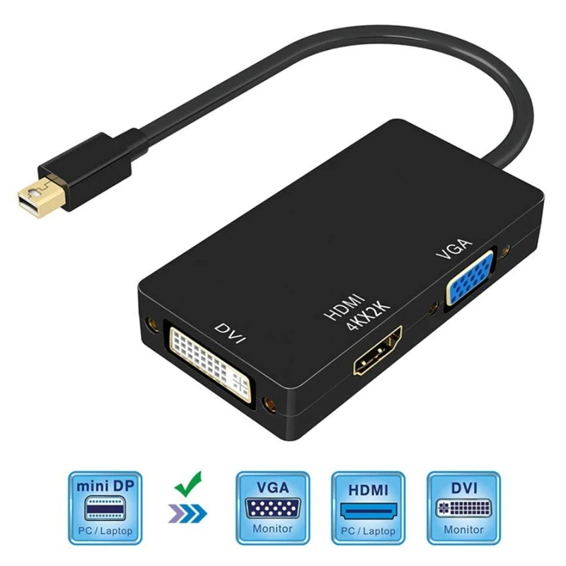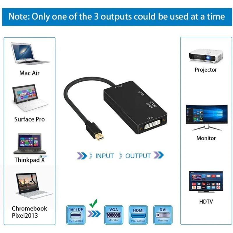 Mini Display Port to HDMI DVI VGA Adapter соединяет Мини Display Port/Mini DP/Thunderbolt 2.0 портов совместимый ПК/MacBook к HDTV, монитору или проектору с портом HDMI/VGA/DVI. (Примечание: только один из 3 выхода могут использоваться одновременно) переходник с дисплейного порта MiniDP на hdmi vga, hdmi, dvi адаптер поддерживается 2-годовая гарантия и Бесплатная пожизненная техническая поддержка.