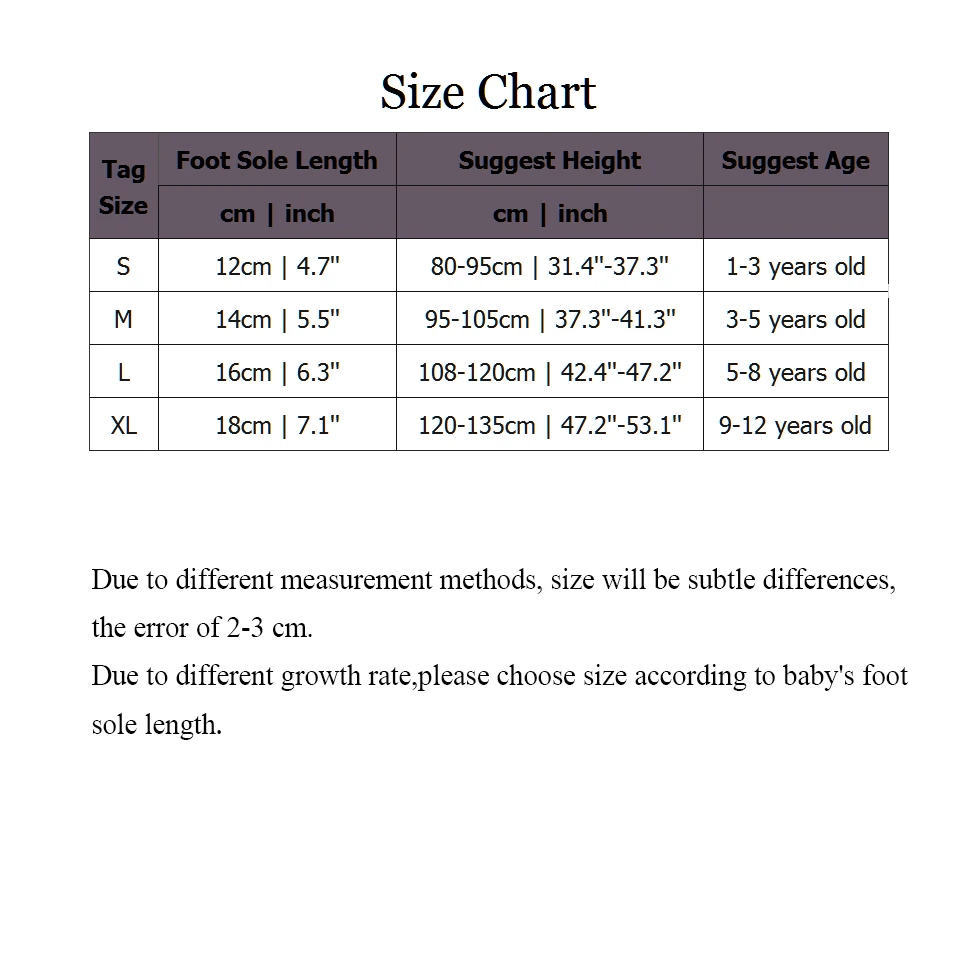 РазмерыДлина подошвы стопыРекомендуемый ростРекомендуемый возрастСм | ДюймСм | ДюймS12 см |4,7''80-95 см |31,4 ''-37,3''От 1 до 3 летМ14 см |5,5''95-105 см |37,3 ''-41,3''От 3 до 5 летL16 см |6,3''108-120 см |42,4 ''-47,2''От 5 до 8 летXL18 см |7,1''120-135 см |47,2 ''-53,1''От 9 до 12 лет
