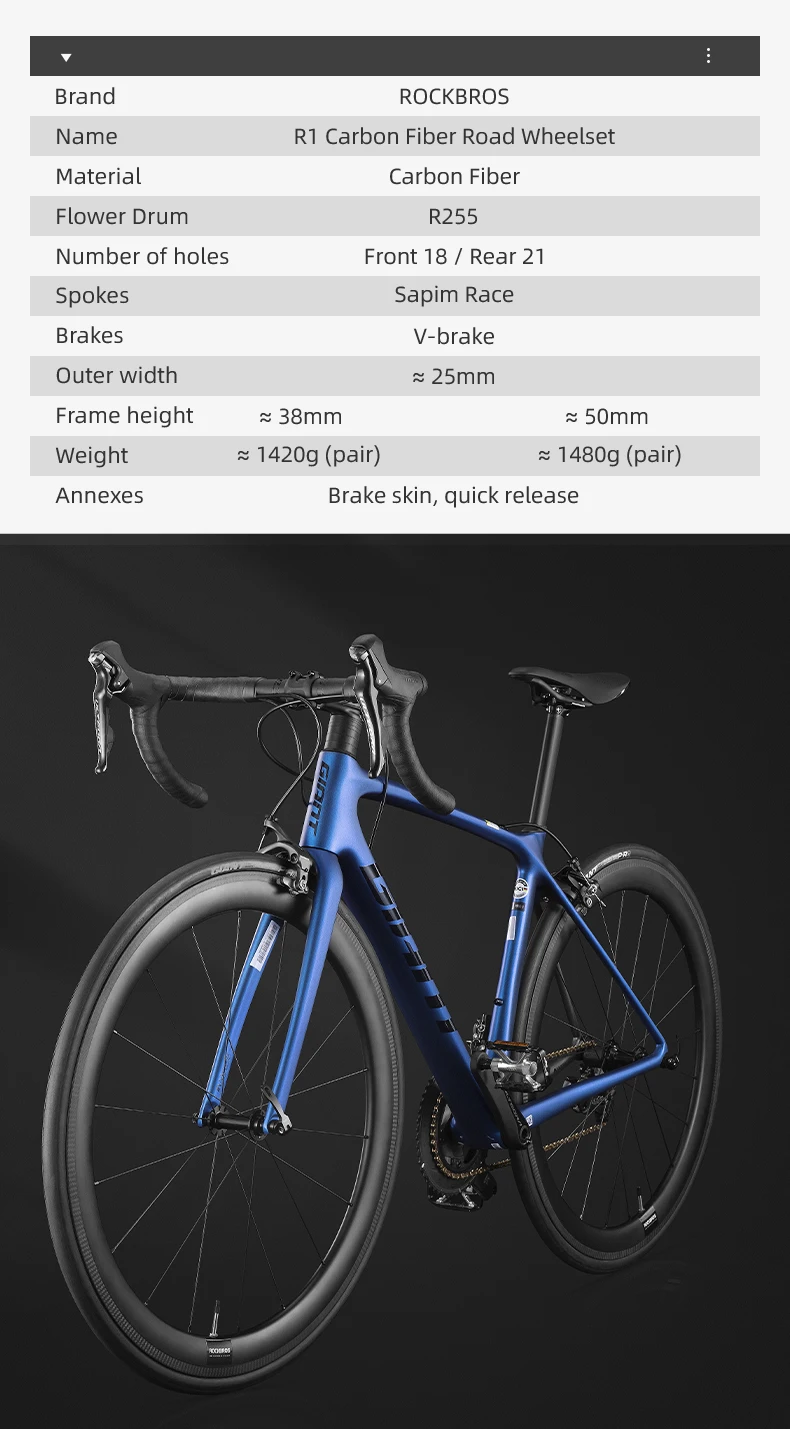 Бренд: ROCKBROS Название: велосипедная колесо Размер: 700C Материал колеса: углеродное волокно применимо для велосипедов: шоссейные велосипеды спицевое отверстие: передняя 18/задняя 21 спица: Sapim Тип гоночного ступицы: r255 концентратор торможения Системы: v-образный номерю внешний Ширина: ≈ с фокусным расстоянием 25 мм высота оправы: ≈ 50 мм/38 мм Вес: ≈ 1420 г (пара) Детали: Тормозная кожа, быстроразъемный