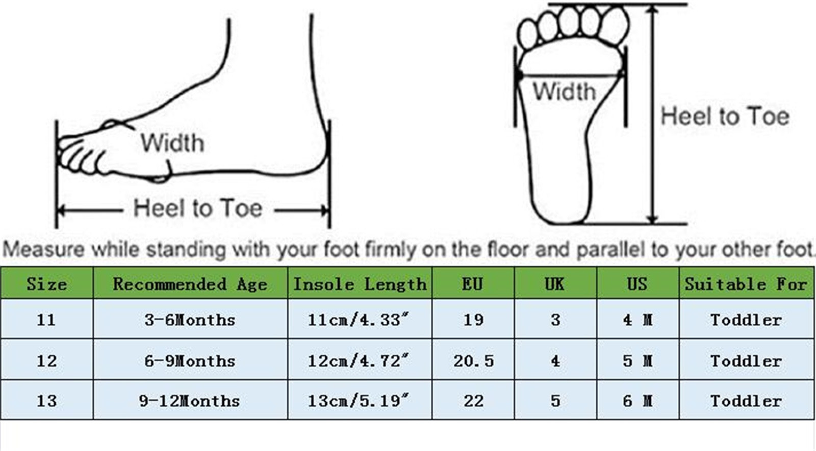 Size Recommended Age Insole Length EU UK US Suitable For 11 0-6 Months 11cm/4.33" 19 3 4 M Toddler 12 6-12 Months 12cm/4.72" 20.5 4 5 M Toddler 13 12-18 Months 13cm/5.19" 22 5 6 M Toddler