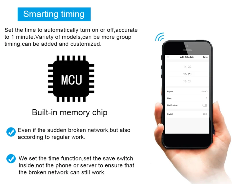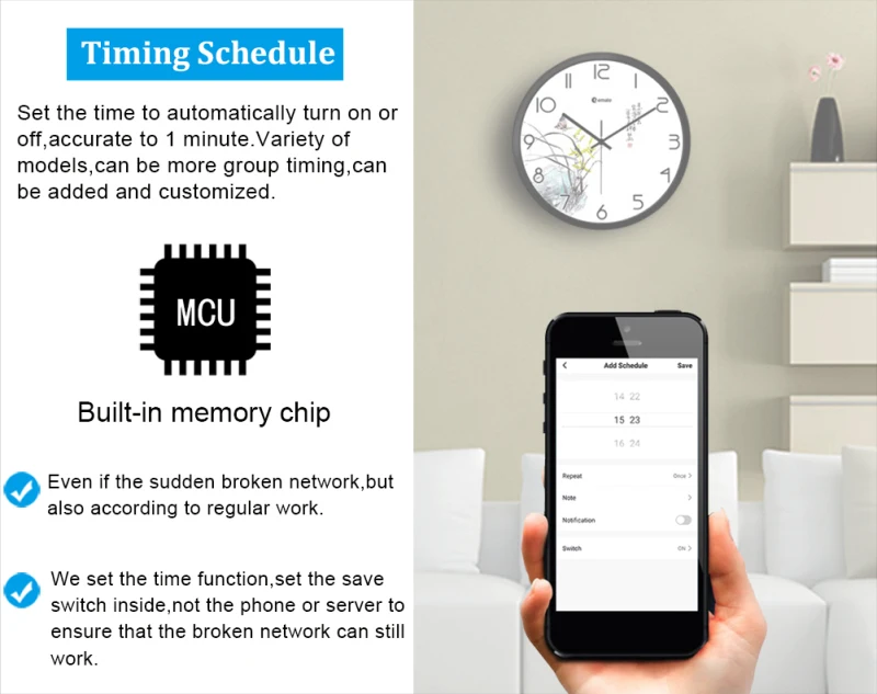 * Поддерживает Макс 8 включенных таймеров по расписанию/обратному отсчету/циклу для каждого устройства.