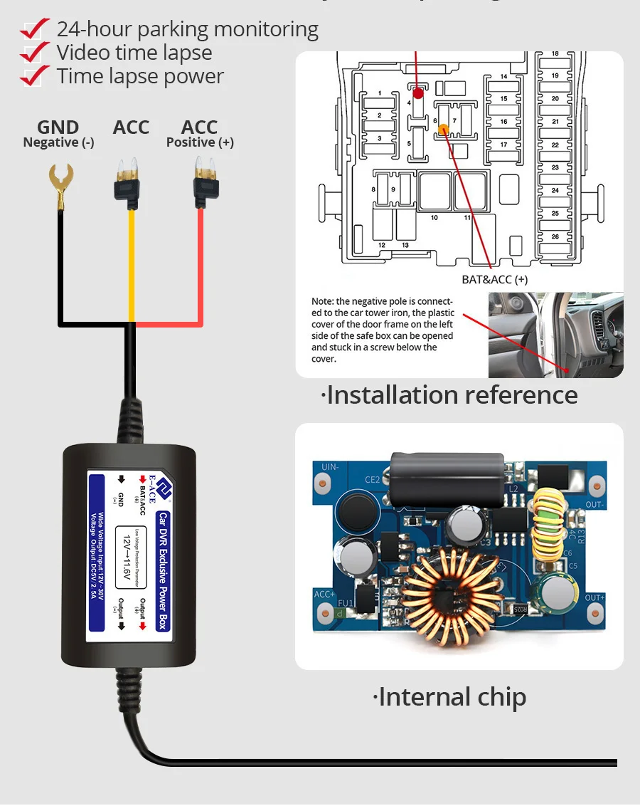 Если вы хотите прекратить мониторинг после парковки (видеорегистратор не работает после парковки), подключите положительный полюс лески buck к интерфейсу предохранителя ACC.