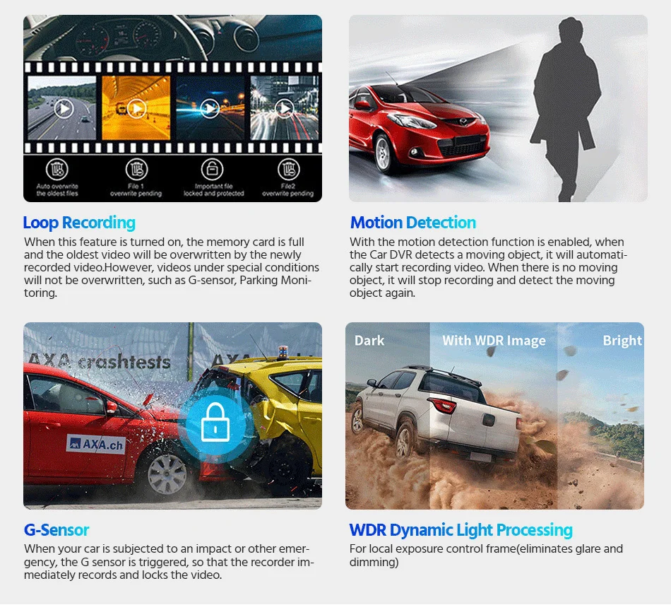 Если видеорегистратор шокирует bv какие-либо внешние силы. Как вор при парковке, он включится для записи автоматически. (Примечание: Автомобильный видеорегистратор Встроенный аккумулятор может не поддерживают воздушную почту столба Кита работать в течение длительного времени, если вы хотите 24 часа в сутки для парковочной системы, пожалуйста, покупайте товары, используя наш трансформаторный кабель линии или OBD кабель.)
