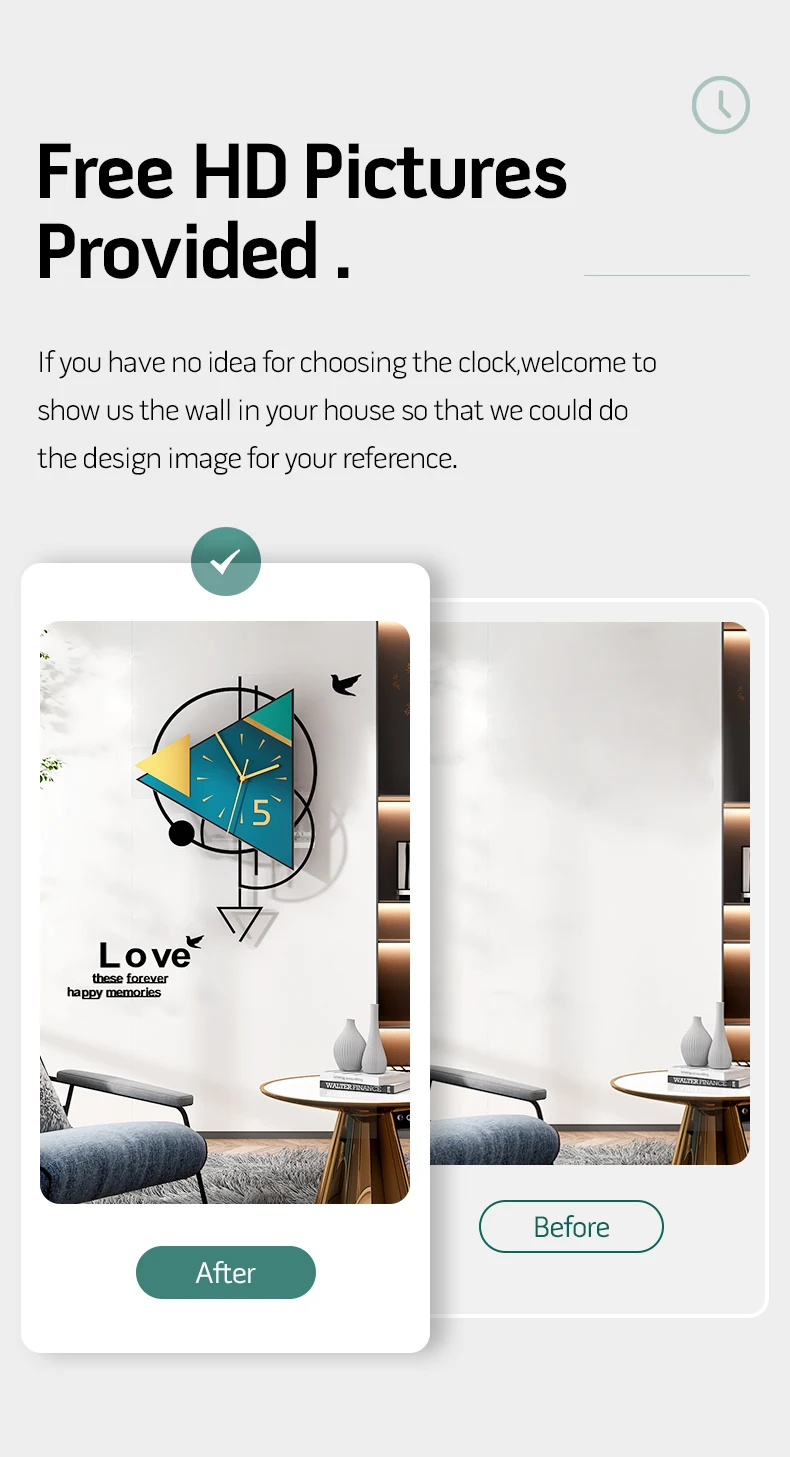 If you have no idea for choosing the clock,welcome to show us the wall in your house so that we could do the design image for your reference.