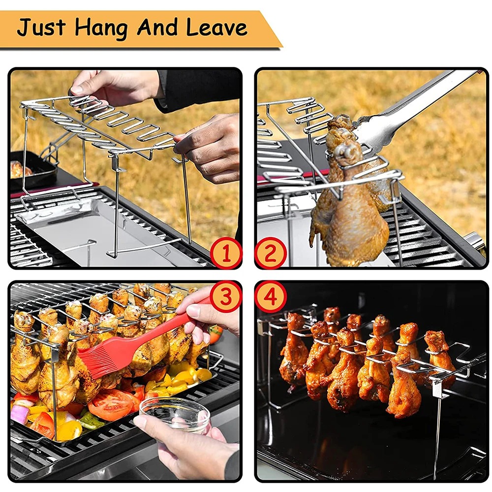 ★【 14 барабанные палочки для гриля 】 держатель для курицы на бедрах вмещает до 14 куриных ножек. Вы можете жарить много куриных ножек за раз, даже бекон, и вам не нужно филе курицы, это позволяет куриным крылышкам и ногам готовить равномерно. Стойка для куриных бедер для гриля, курения, выпечки или обжига в духовке; Зазор идеального размера, и слоты были сплющены, тогда он может держать любой размер курицы голени.