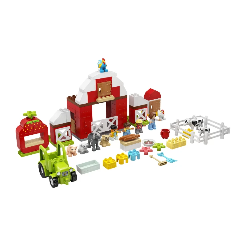 В наборе есть трактор, свинья, овца, лошадь, собака, курица, петух, 2 коровы, 4 фигурки LEGO® DUPLO®, сарай для сборки, тюк сена с реалистичной текстурой и множество крутых аксессуаров.