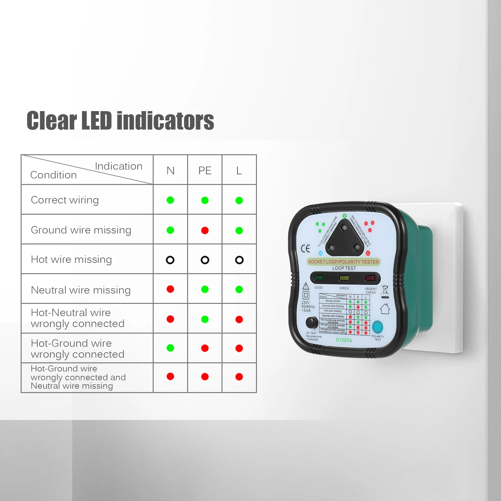 Able to indicate 7 possible conditions: correct wiring, missing ground wire, missing live wire, missing neutral wire, live / neutral reverse, live / ground reverse, live / ground reverse & missing ground.
