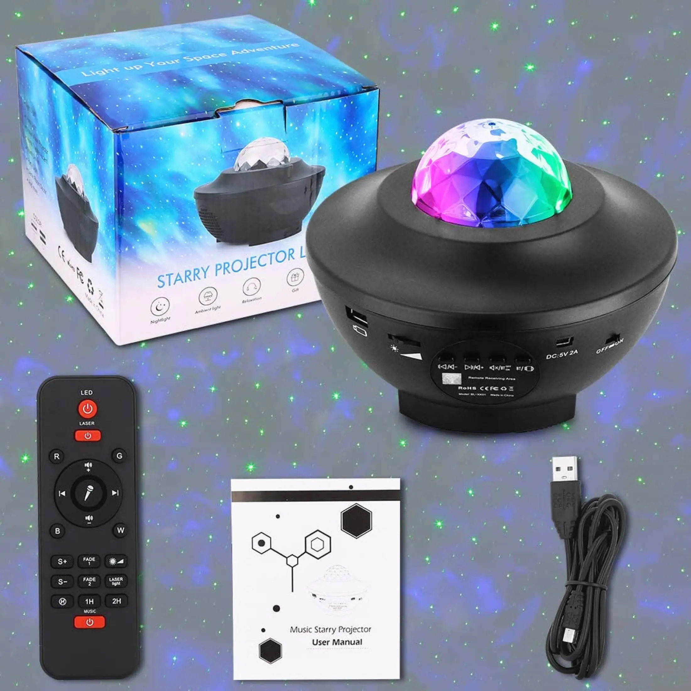 Работает со смартфонами через Bluetooth или просто вставляет tf-карту, вы можете наслаждаться музыкой, чтобы расслабиться, или воспроизводить звук сна, чтобы помочь вашему ребенку/детям спокойно спать. С уникальным звуковым режимом, свет мерцает и изменяет шаблоны с ритмом музыки, в результате чего происходит проекция звездного неба.