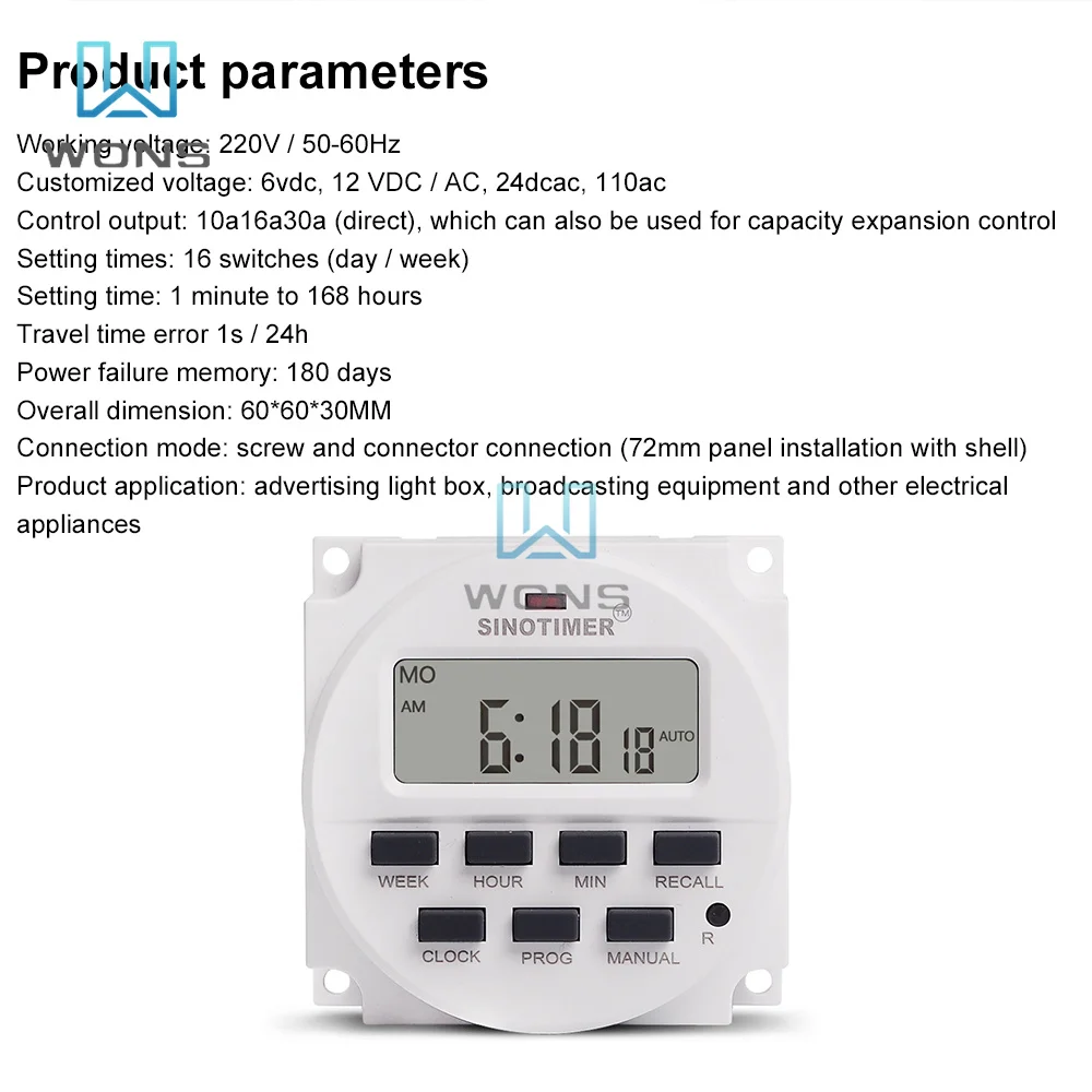 Переключатель контроля времени серии TM618 (615)-это продукт, который контролирует автоматический цикл включения и выключения электрического оборудования через заданное пользователем время продукта, для достижения экономии энергии и эффективного интеллектуального опыта производства электроэнергии. Контрольные объекты могут быть уличными огнями, неоновыми огнями, рекламными знаками, производственным оборудованием, радио и телевизионным оборудованием, а также всем электрическим оборудованием и бытовыми приборами, которые необходимо включать или выключать через регулярные промежутки времени.