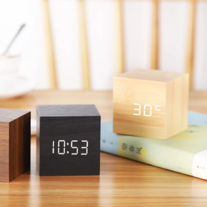 1 шт. современный деревянный куб USB голосовой цифровой будильник светодиодный дисплей Despertador светящиеся часы управления