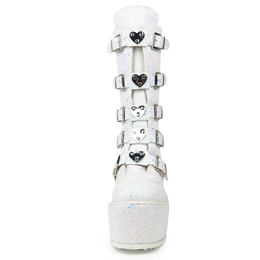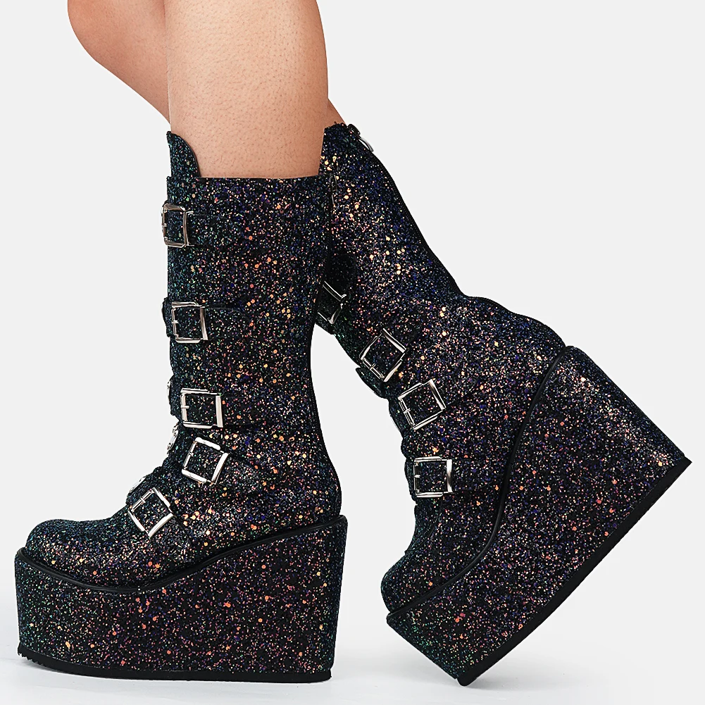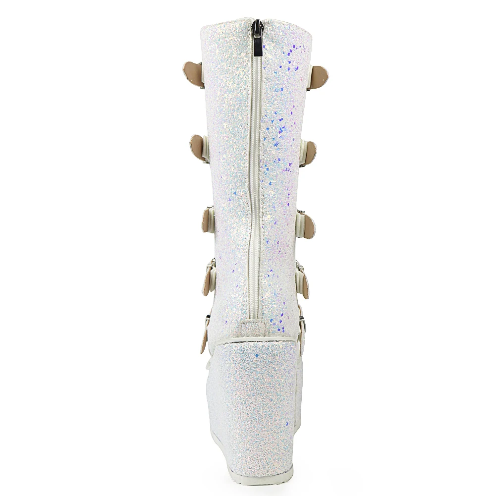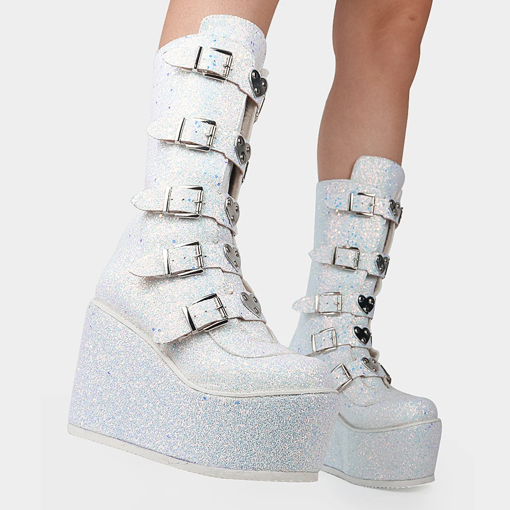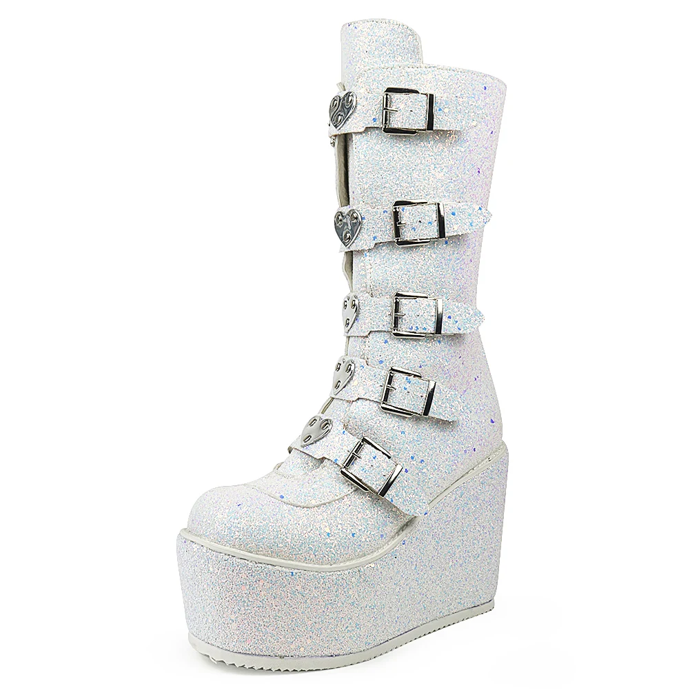 Женские Серебристые сапоги с металлическим украшением и пряжкой на ремешке; Женские сапоги до колена до середины икры на платформе и молнии; Женская обувь на танкетке; Коллекция 2021 года; Сезон осень
