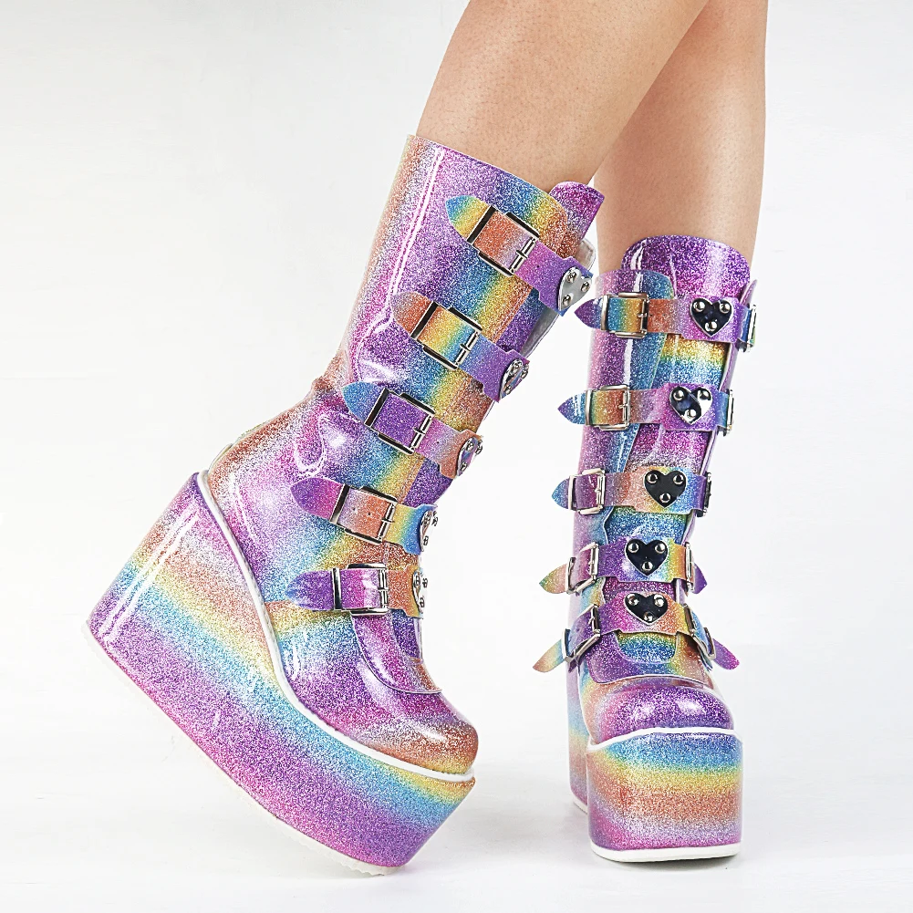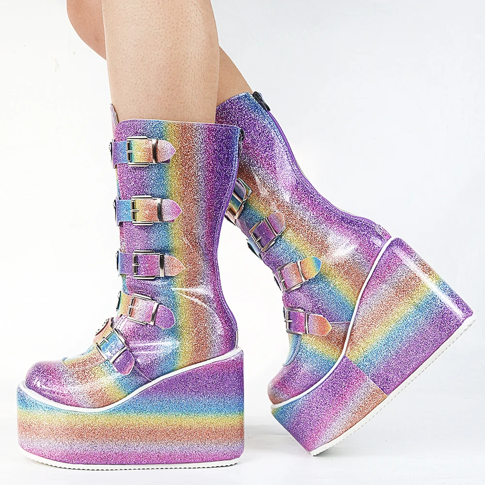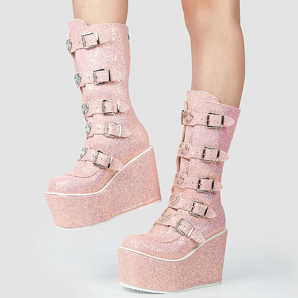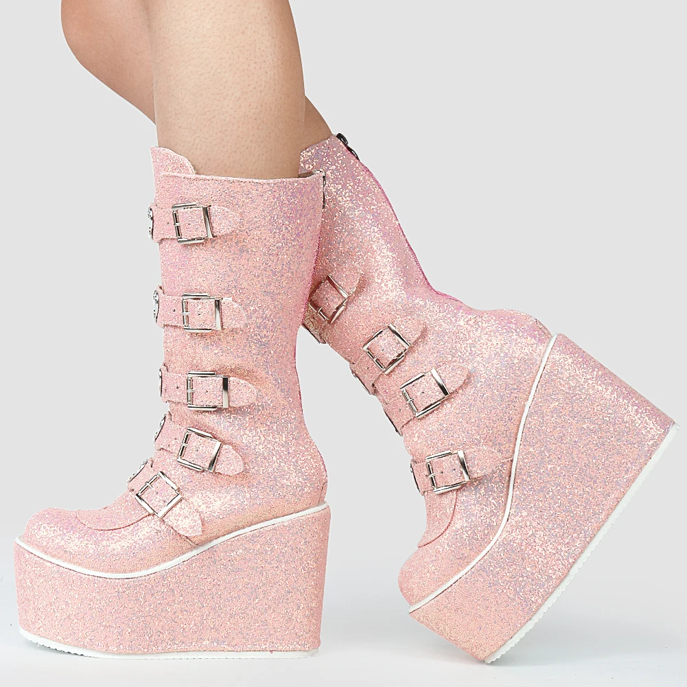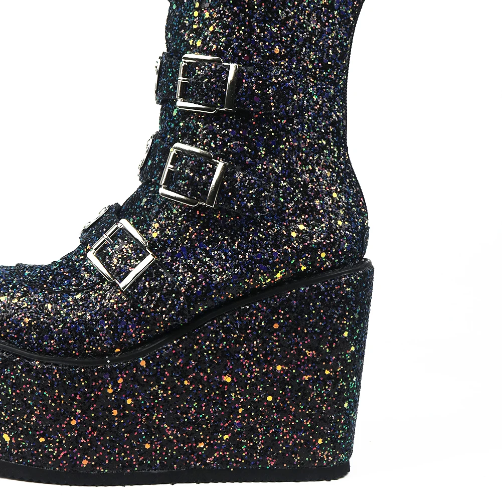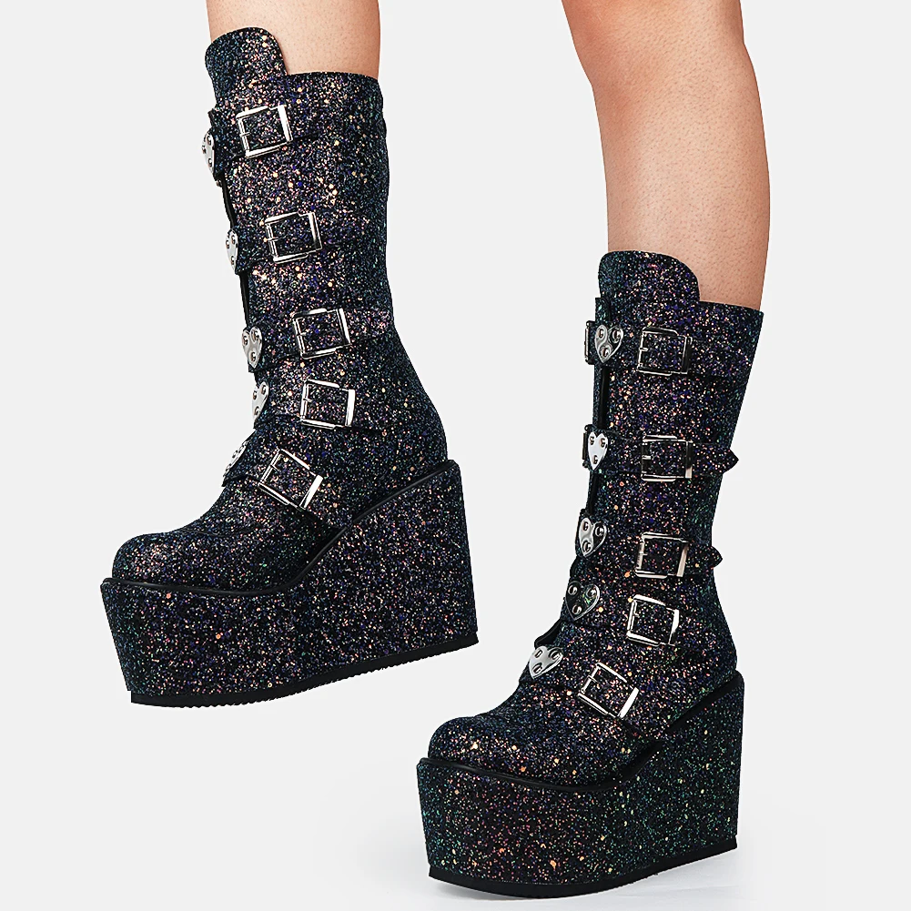Женские Серебристые сапоги с металлическим украшением и пряжкой на ремешке; Женские сапоги до колена до середины икры на платформе и молнии; Женская обувь на танкетке; Коллекция 2021 года; Сезон осень