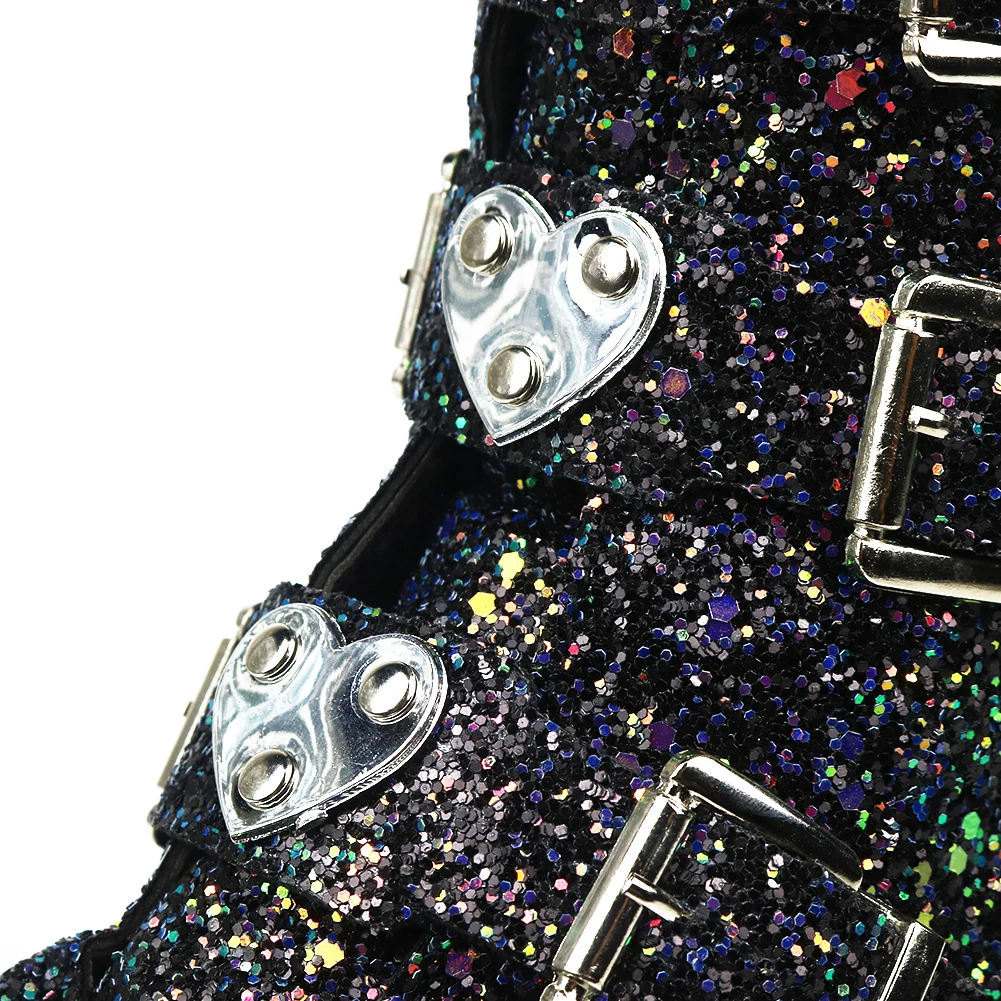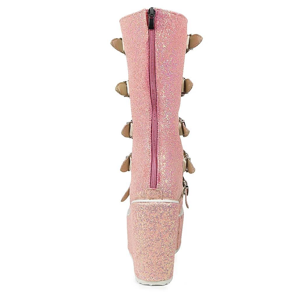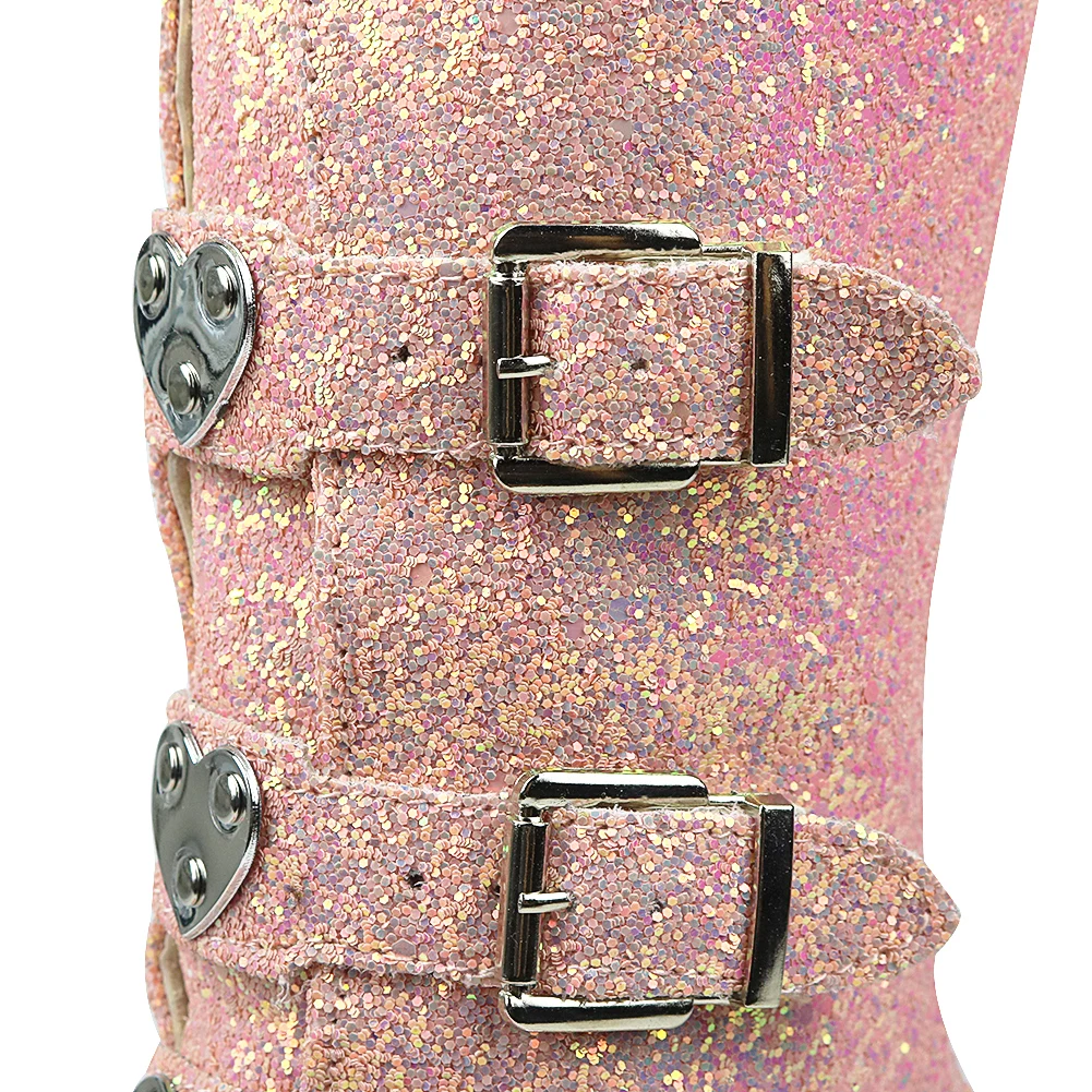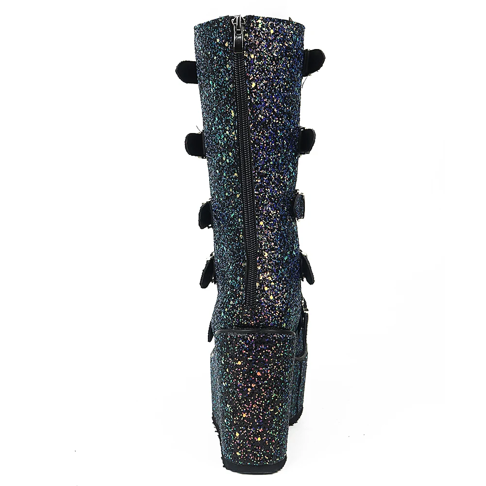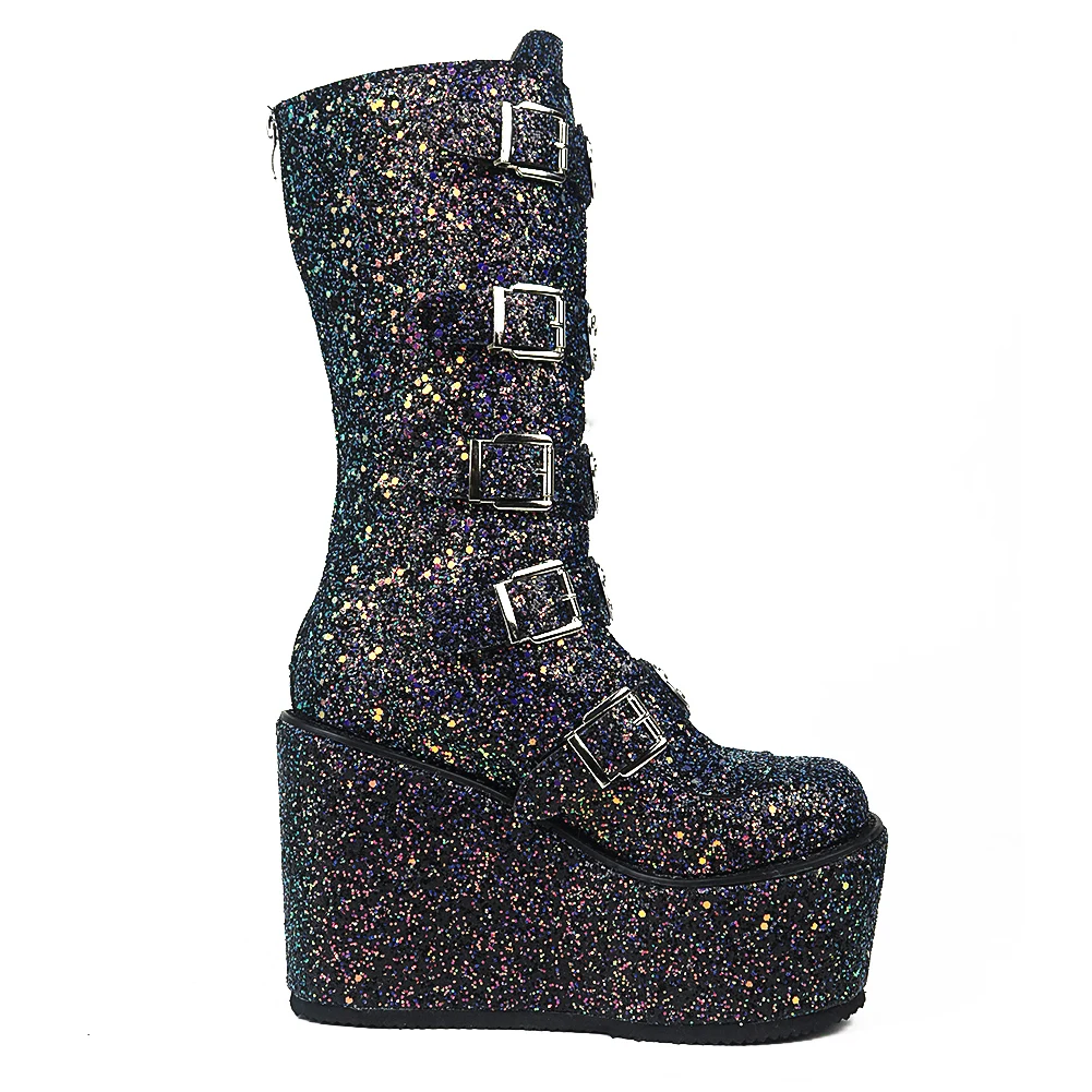 Женские Серебристые сапоги с металлическим украшением и пряжкой на ремешке; Женские сапоги до колена до середины икры на платформе и молнии; Женская обувь на танкетке; Коллекция 2021 года; Сезон осень