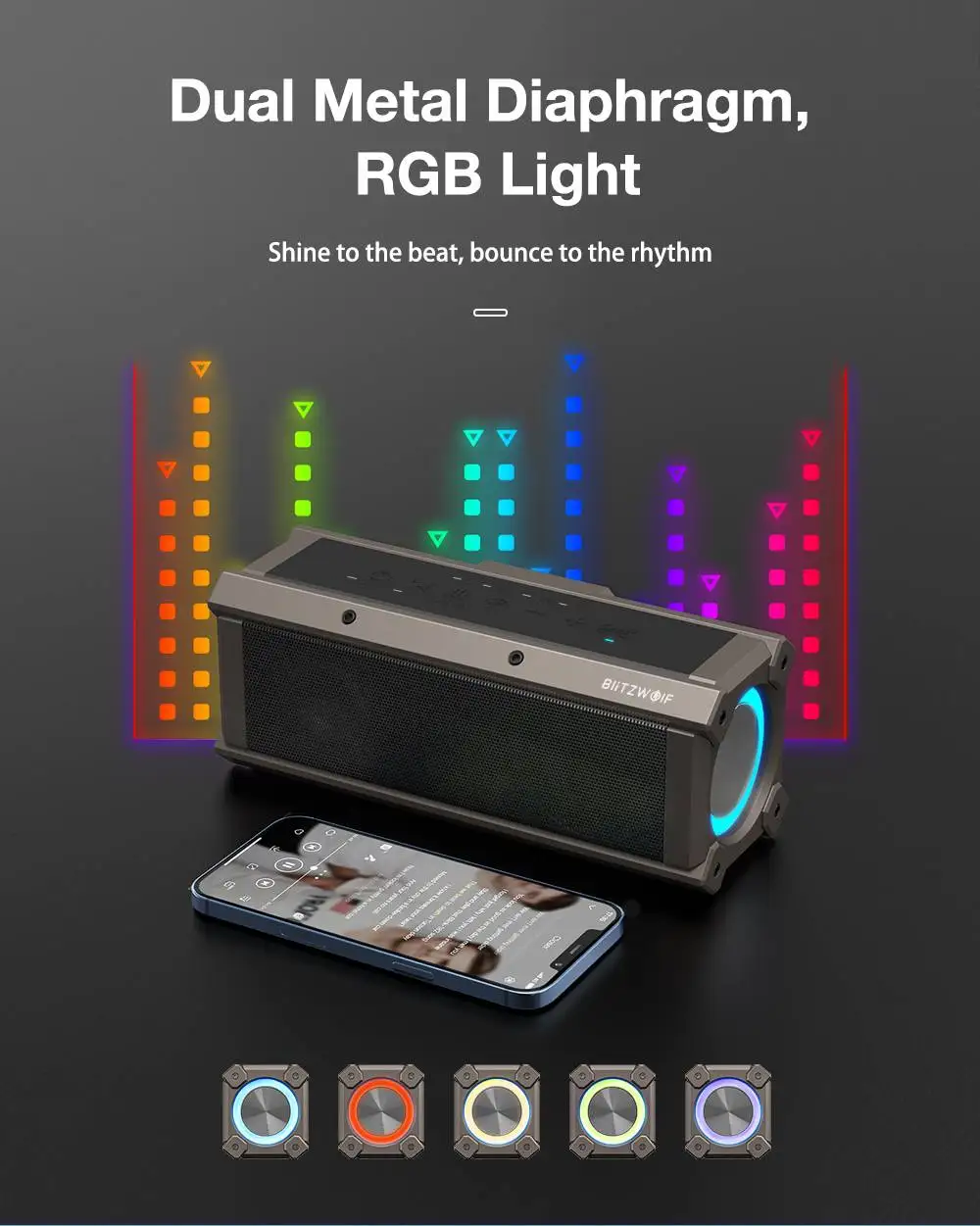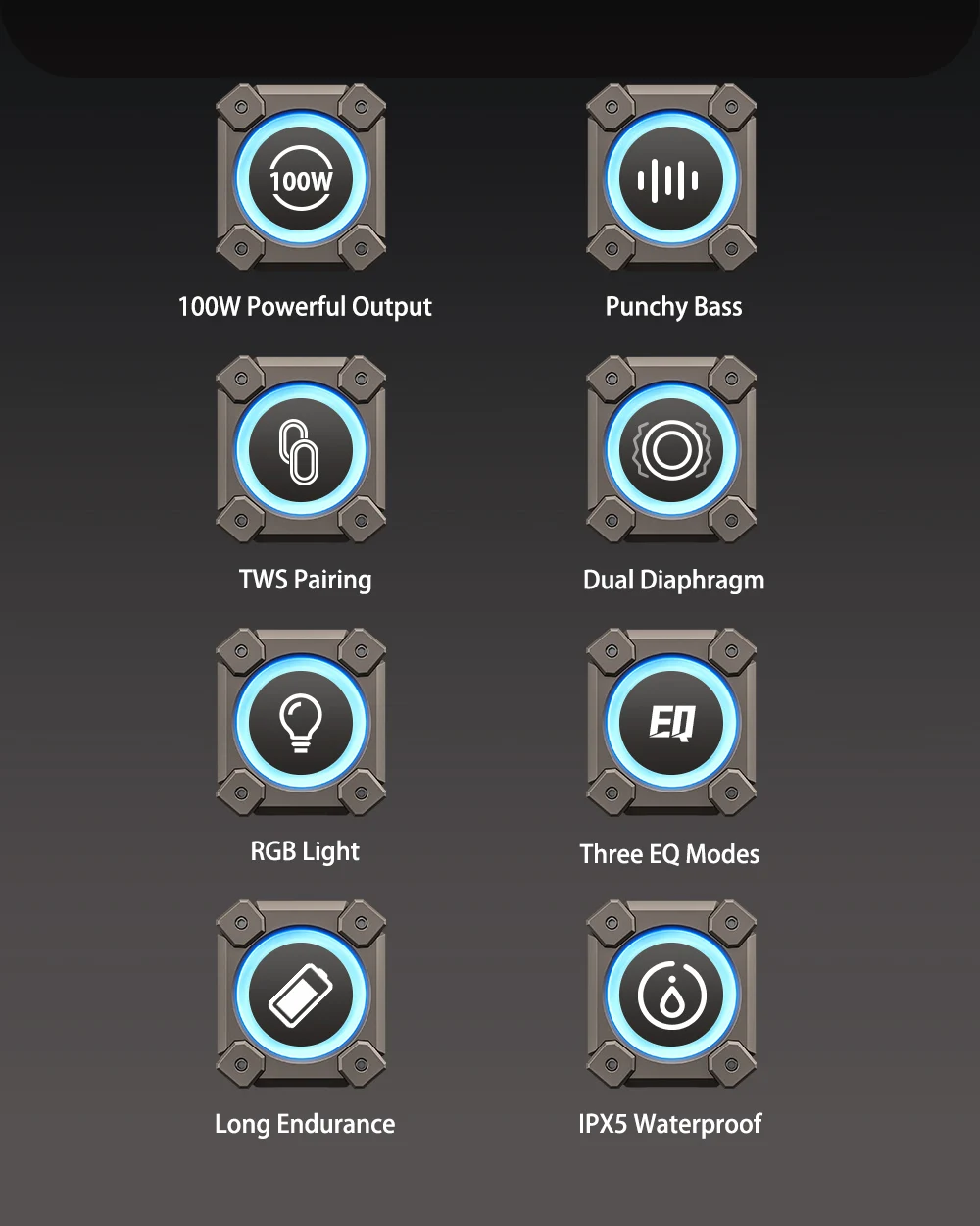 -Мощный выход 100 Вт-ударопрочные Басы-сопряжение TWS-Двойная диафрагма-RGB светильник-три режима эквалайзера-Долговечность-Водонепроницаемость IPX5