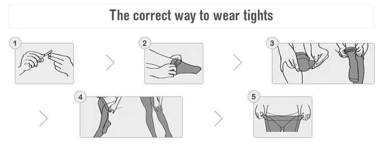 1. Гладко отполируйте ногти, чтобы не зацепить колготки. 2. Закатывается с носка. 3. Отрегулируйте положение носка и пятки, сделайте колготки подходящими для вашей ноги. 4. Встаньте и вытяните колготки с левой и правой стороны. 5. Убедитесь, что ваши колготки подходят к вашим ногам, Удерживают и растягивают колготки в основной части тела, а затем приподнимите колготки к талии.