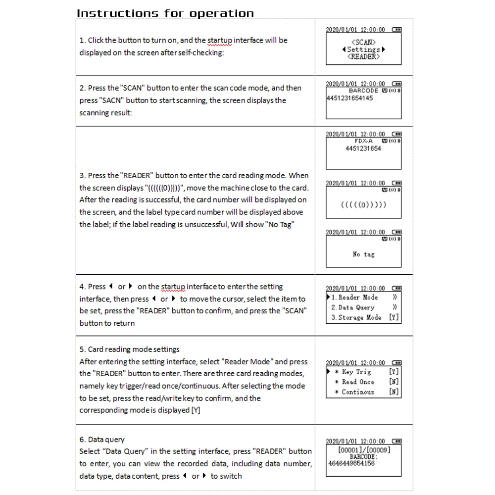 Считыватель тегов животных-это беспроводной считыватель RFID, который поддерживает электронные метки в форматах сканирования EMID, FDX-B (ISO1784/85) и обычных штрих-кодов/двумерных кодов. Продукт использует высокояркий oled-дисплей, который может быть четко отображен в помещении и на открытом воздухе сильный светильник. С собственной функцией хранения данных, он может хранить до 6000 тегов, которые могут быть загружены на компьютер через USB кабель передачи данных, беспроводной и Bluetooth.