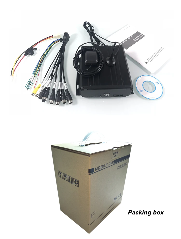 MDVR + аудио и видео кабель + шнур питания + IO триггер кабель + 3G антенна + GPS антенна + CD + пульт дистанционного управления + ключ + руководство
