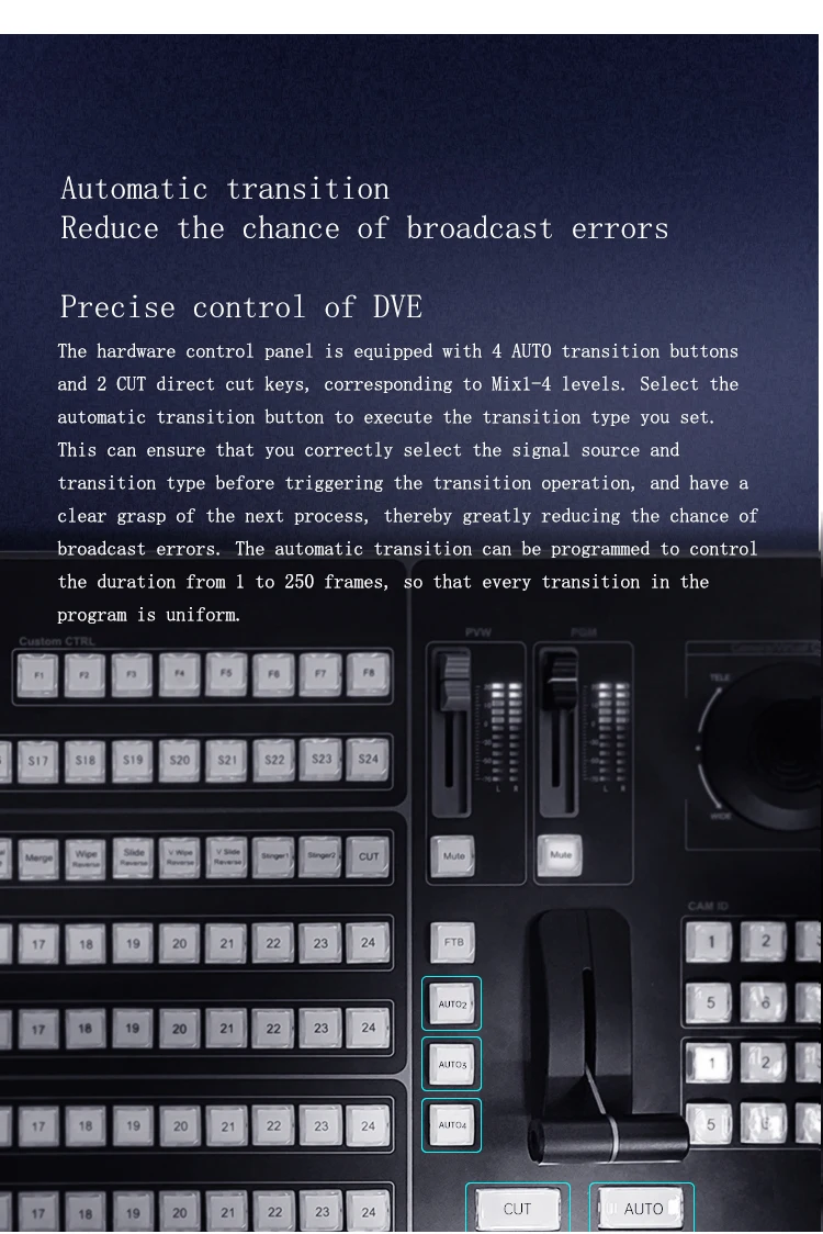 The main body of the TYST 4M/E Advanced Panel switcher is made of aluminum alloy CNC technology. The panel is frosted and equipped with broadcast-grade high-quality buttons, audio faders, T-shaped faders and PTZ Confucius Hall. The TYST 4M/E Advanced Panel switcher panel has 4M/E control buttons. For high-end live events, you can assign a button to each input signal, as well as wipe, overlay, function keys, and macro commands. And other functions.