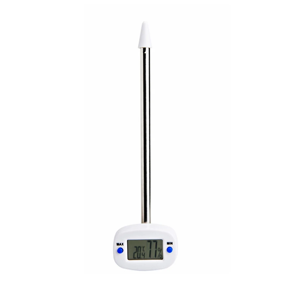 Размер: 44*30*30 мм Вес: 45 г Погрешность: ± 1 ℃ Точность: 0,1 ℃ Длина зонда: 140 мм Диапазон измерения температуры: -9 ℃ ~ 110 ℃ Диапазон измерения влажности: 30% ~ 98% Режим питания: кнопочный аккумулятор × 1 (не входит в комплект)Замечено:Зонд должен быть вставлен в почву 2/3 глубины (10 см был вверх), и измерение является наиболее точным