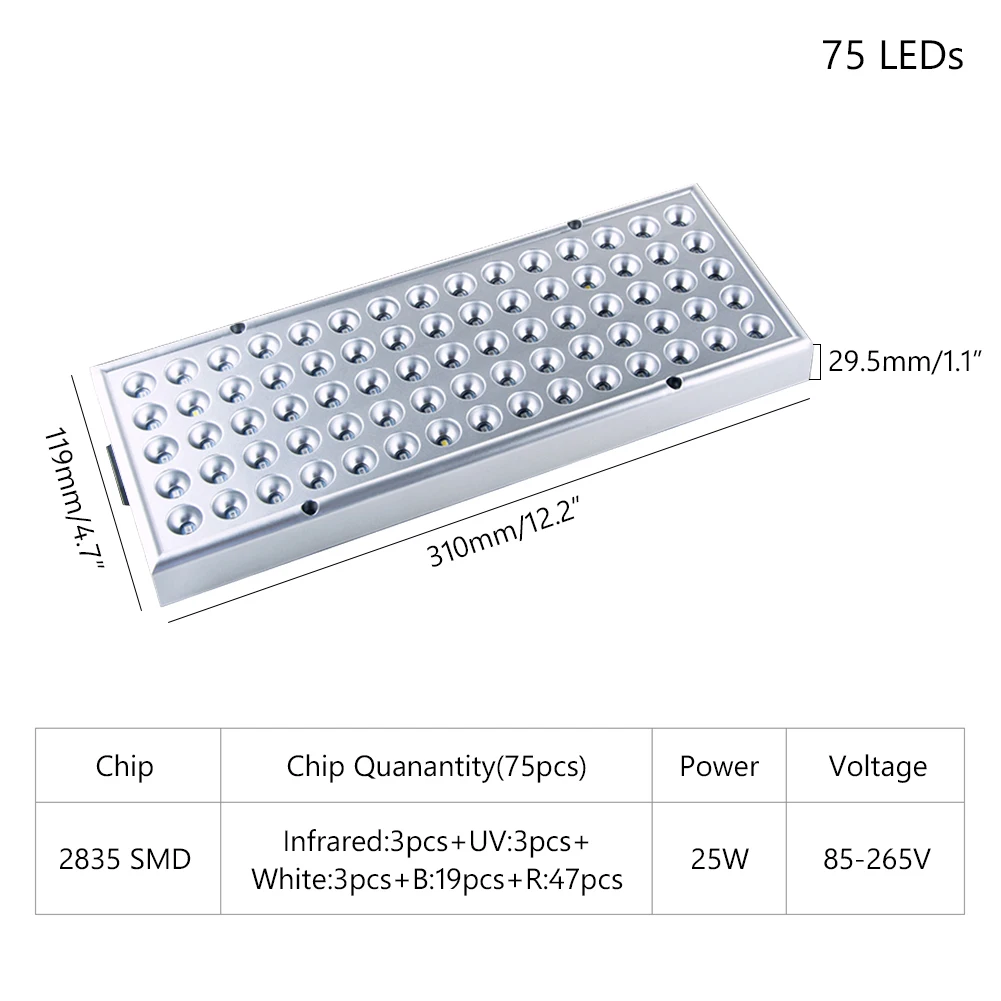 Количество СВЕТОДИОДНЫЙ: 25 Вт, 75 шт., 47 красный + 19 синий + 3 белый + 3 УФ + 3 ИК