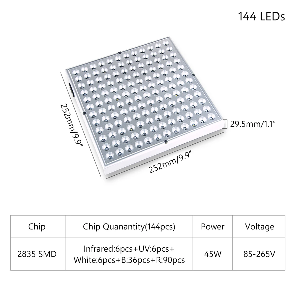 45 Вт, 144 шт. 90 красный + 36 синий + 6 белый + 6 УФ + 6 ИК
