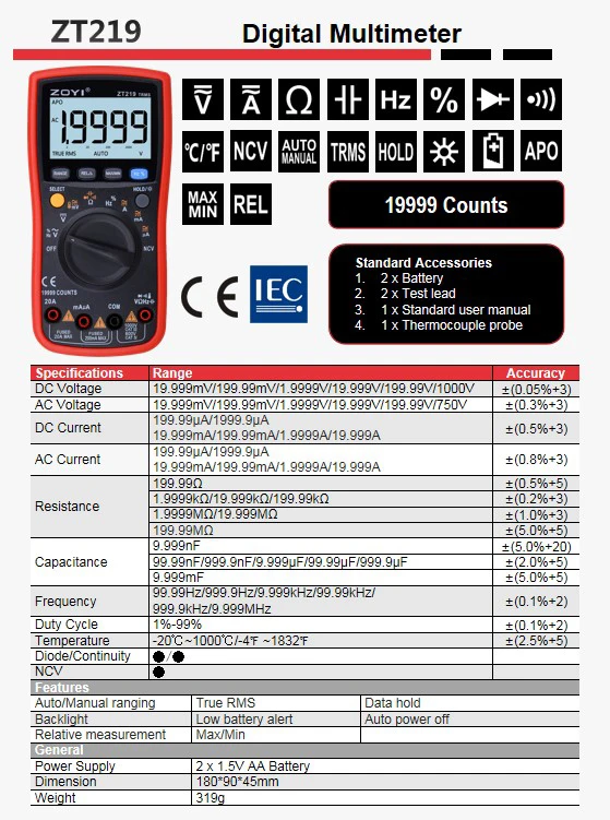 ZOYI ZT219 Цифровой мультиметр 19999 отсчетов подсветка AC/DC Амперметр Вольтметр Ом REL поддержка
