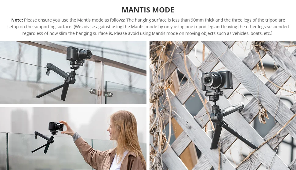 ● Больше совместимости: FUJI:X-T4,X-T200,X-T100,X-A7,X-A5,X-100V,X-100F,X-F10,X-S10,X-E4X-E3 | NIKON:COOLPIX Series,Z 50 | PANASONIC:G Series (LUMIX G100) | OLYMPUS:PEN SeriesE-M10 | Сотовый телефон, не превышающий 90 мм. Более того: легкий, но прочный магниевый штатив (0,74 фунта). Грузоподъемность 5.51LBS. Толщина подвесной поверхности должна быть менее 90 мм. Режим мантирования штатива DSLR является наиболее стабильным, когда основная нога висит, а другие ножки расположены на твердой поверхности