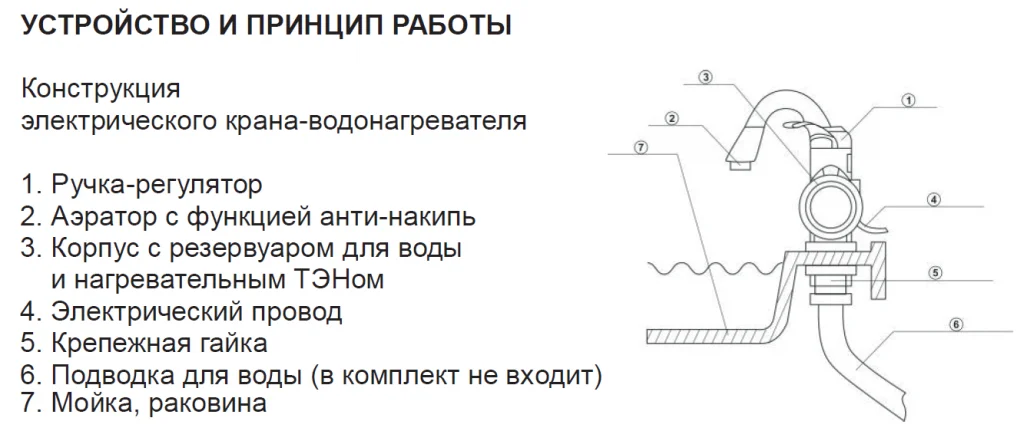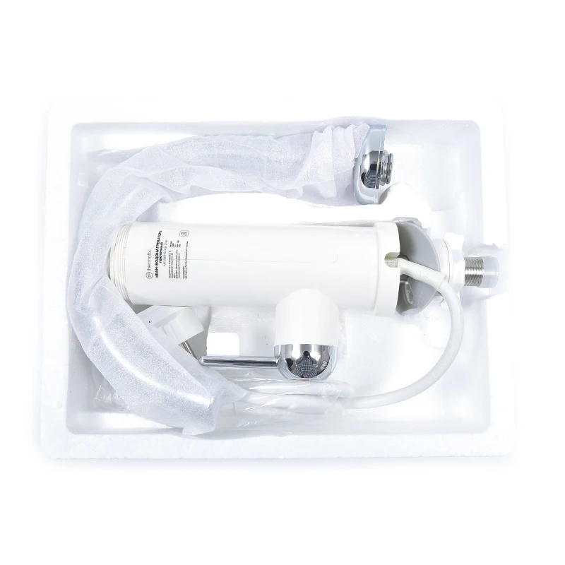 Кран-водонагреватель с УЗО* в сборе 1 шт Комплект пластиковых гаек-переходников 1 шт В комплекте: 3 шт. для внешней резьбы, 3 шт. для внутренней резьбы 1 шт. с обжимным хомутом для крана без резьбы 3 шт прокладки 1 шт монтажный ключ Руководство по монтажу и эксплуатации 1 шт Упаковка (картон+полиэтилен) 1 шт