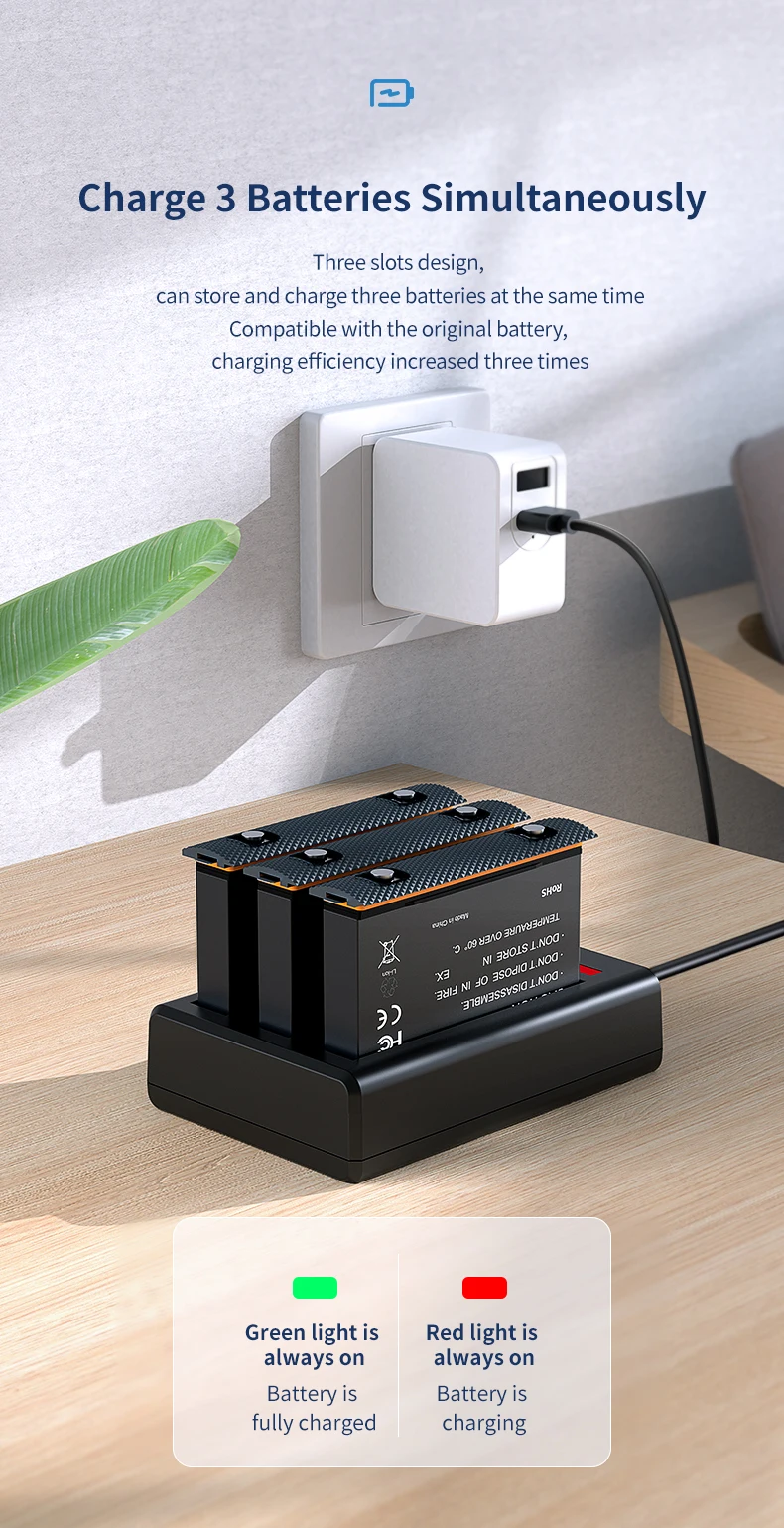 1,3 Слоты дизайн, можно хранить и заряжать 3 батарейки в одно и то же время, совместимый с оригинальной батареи, эффективную зарядку, визуально увеличивающая рост на 3 раза.