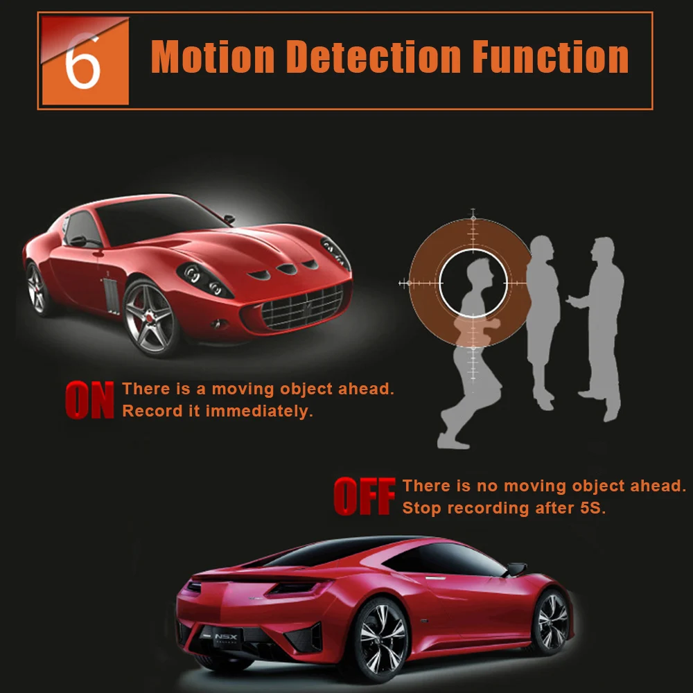 Обнаружение движения, Поддержка мониторинга парковки: когда фронтальная камера находится в неподвижном состоянии, видеорегистратор прекратит запись,Когда камера обнаруживает движение объекта, видеорегистратор автоматически записывает видео.Поддержка циклической записи: когда tf-карта заполнена, она будет автоматически удалена, предыдущее видео и будет постоянно записывать.