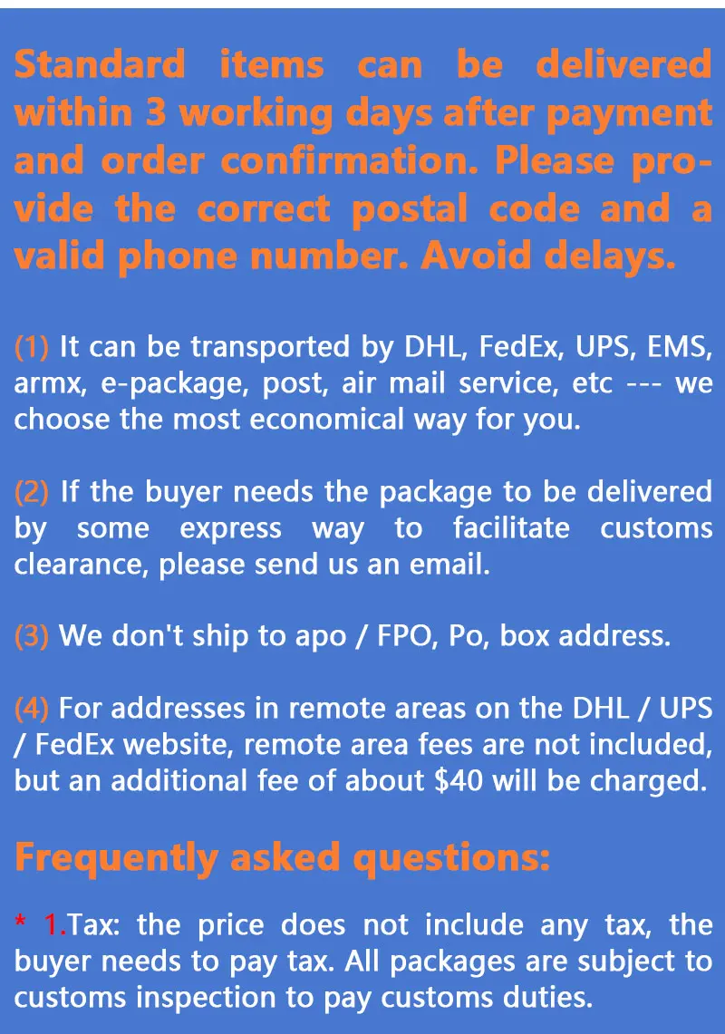 Текущая ссылка отображает инклюзивный налог цены в 27 странах ЕС. Однако для заказов, превышающих 150 евро, выберите офлайн-методы логистики, такие как DHL, EMS и FedEx, не оплачивая таможенные пошлины. Если у вас есть какие-либо вопросы о таможенных пошлинах, пожалуйста, свяжитесь со службой поддержки клиентов магазина в любое время