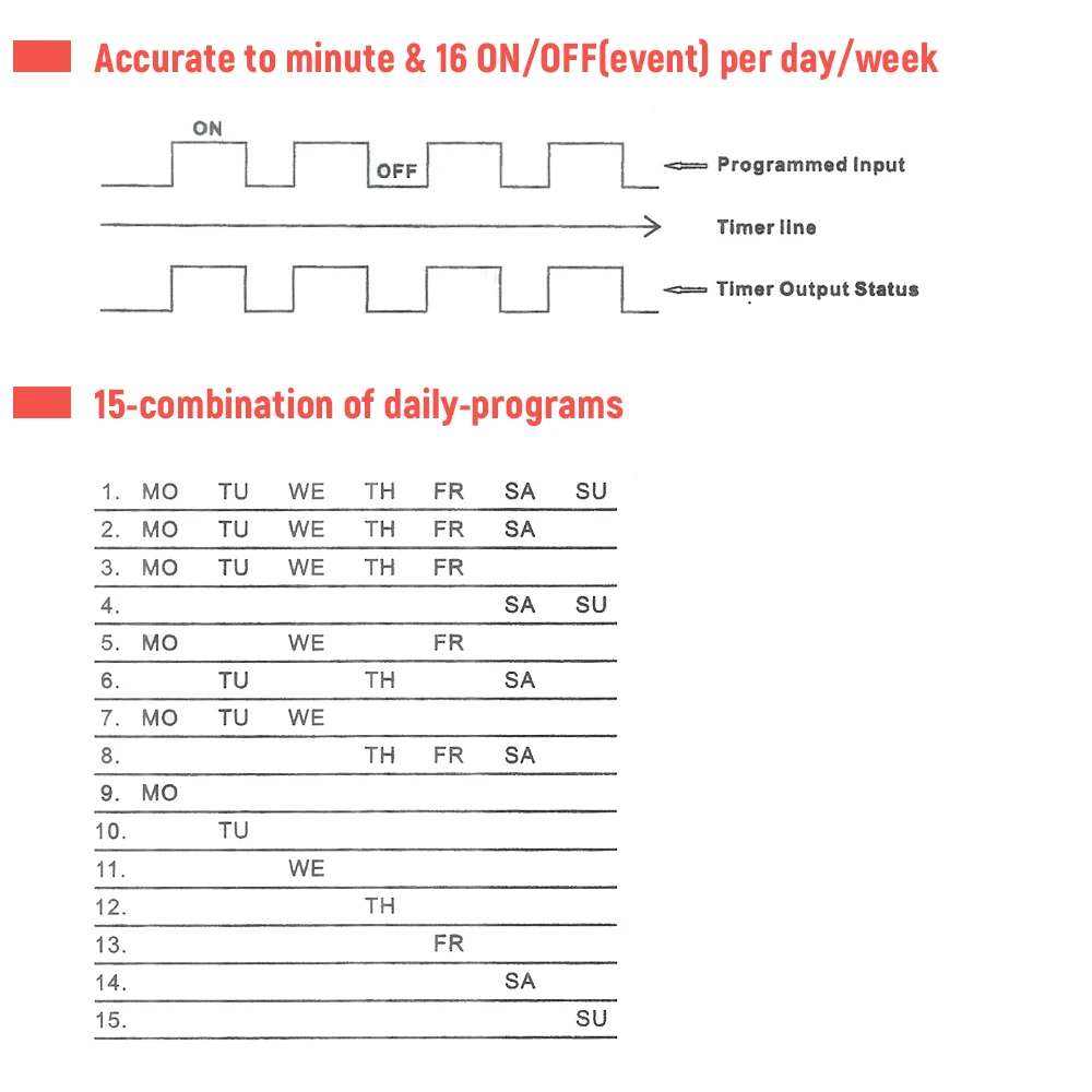 Цифровой таймер надежный, прочный и точный до минуты, разработан с 15 комбинацией ежедневных программ, которые могут привести к большому удобству для пользователей при выборе необходимых дней в неделю для работы таймера. Он широко используется в управлении электрическим оборудованием, таким как уличный фонарь, светильник, радио, телевидение и т. д.
