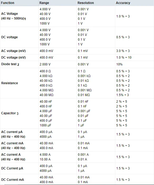 Полная функция измерения: напряжение переменного/постоянного тока, переменный/постоянный ток, мА/мкА, сопротивление, емкость, диод, ВКЛ/ВЫКЛ.