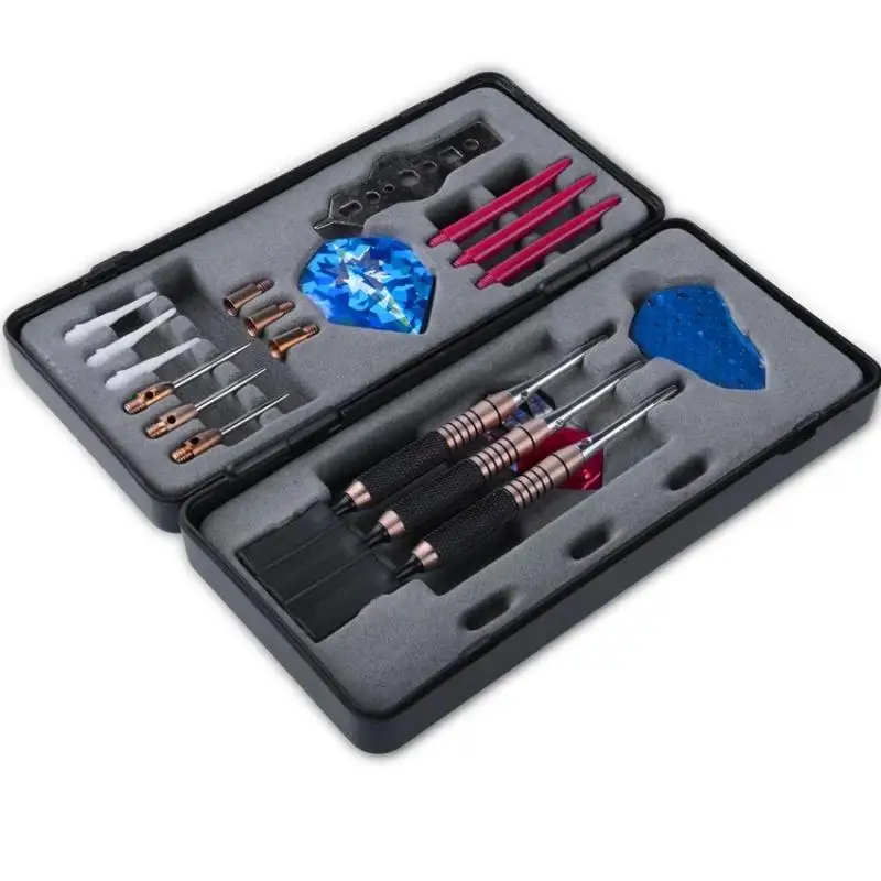 Полный набор из 25 Дротика в чехол для переноски. Набор содержит 3x18 г Дротика s, 9 полетов, 3 нейлоновых вала, 3 точечных преобразователя, 3 веса, 3 мягких наконечника и металлический инструмент для метания дротиков. Идеальный подарок для любителей дартс и новичков.