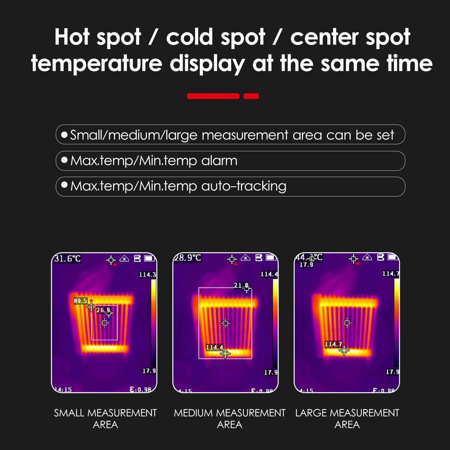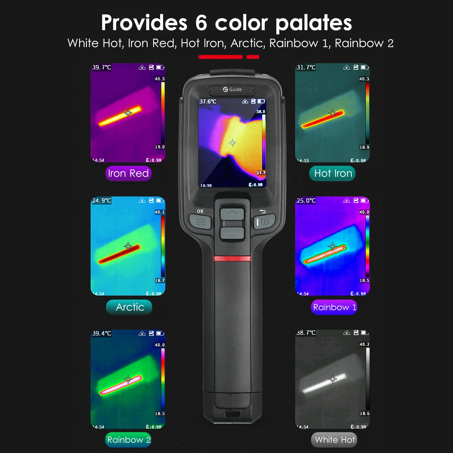 Оснащен 2,4 дюймов IPS на тонкопленочных транзисторах на тонкоплёночных транзисторах дисплей, он может отображать горячих точек, холодное место и центр точечный температуры в одно и то же время и обеспечиваем 6 цветов вкус.