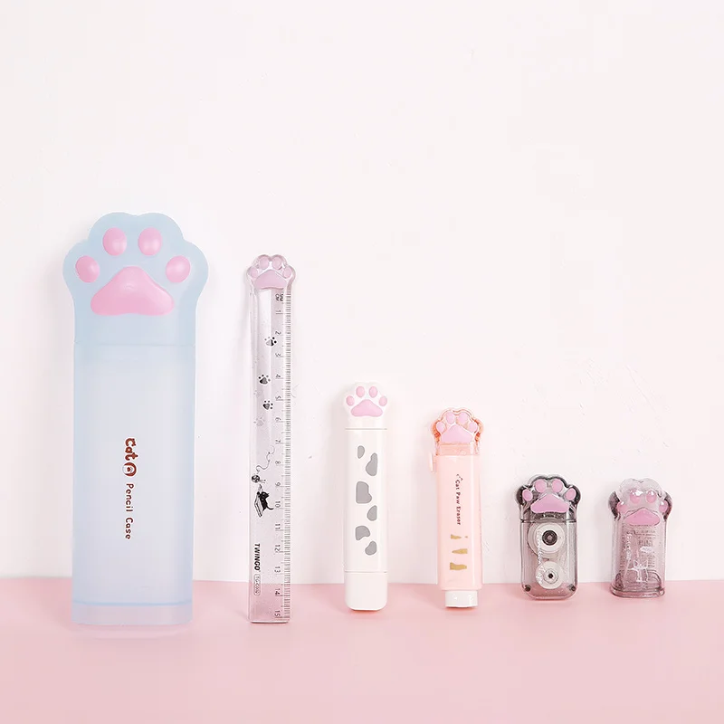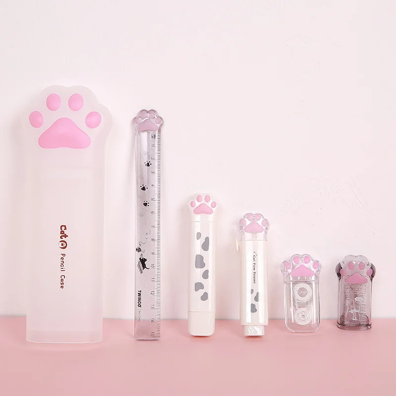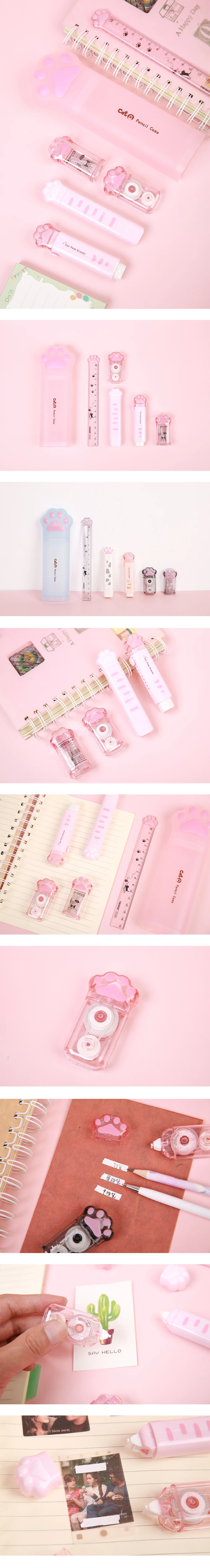 В комплект входит: линейка * 1, Корректирующая лента * 1, ластик для нажима * 1, двуглавый артефакт * 1, точилка для карандашей * 1, чехол для карандашей * 1